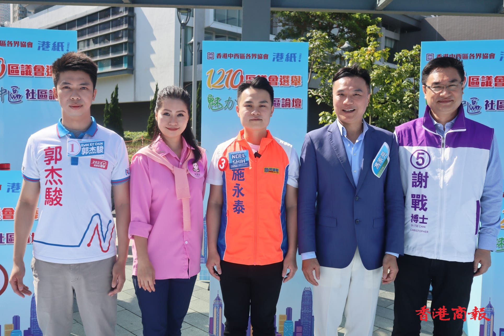 中西區(qū)區(qū)議會地方選舉的10名參選人今日(25日)分別在西營盤和堅尼地城舉行選舉論壇,他們分別是中區(qū)選區(qū)的郭杰駿(新民黨),彭舜玟,施永泰(民建聯(lián)),馮家亮(自由黨),謝戰(zhàn);以及西區(qū)選區(qū)的吳家超(新民黨),劉天正(民建聯(lián)),王倩雯,李楚婷,劉家昂。2個選區(qū)都是5人競爭2個議席。論壇下每名參選人都有數(shù)十名支持者撐場,亦吸引不少街坊圍觀,氣氛熱鬧。