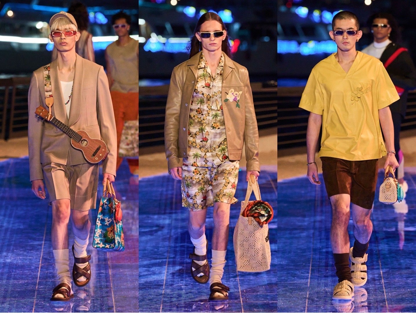 今季男裝與上一季相比大幅削減了標(biāo)誌性的棋盤格與老花元素,從嚴(yán)肅著裝轉(zhuǎn)向更為年輕的款式剪裁,以及更加花俏的設(shè)計(jì)裝飾。豐富多樣的夏威夷風(fēng)情和海洋元素融入服裝設(shè)計(jì)中,如潛水服、沖浪服等,讓整個(gè)系列散發(fā)出一股度假的閒適氣氛,令觀眾恍如置身於夏威夷的美麗海灘。