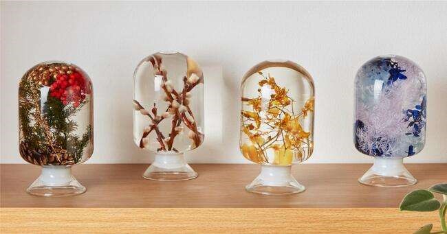 韓國設(shè)計工作室 Studio Style Jieum 設(shè)計的 Pieces of Time Objet d’Art,將盛開的鮮花保存於手工吹製的圓頂玻璃中,造型別致。
