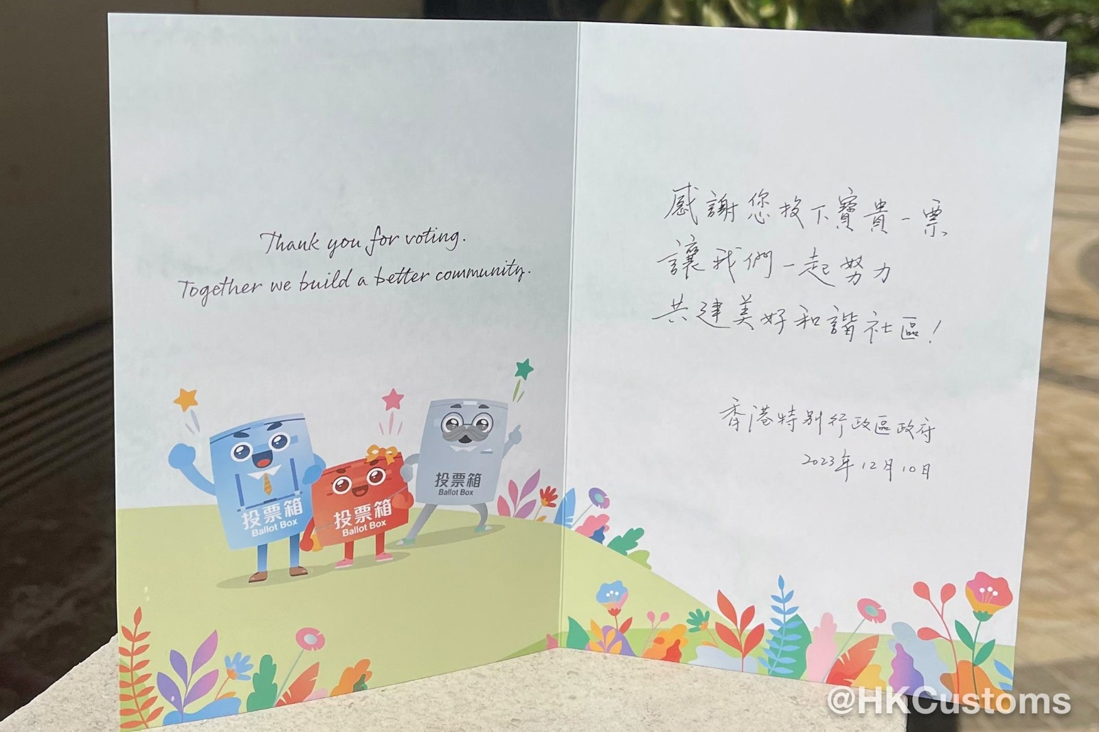 海關(guān)呼籲各位選民把握時間,於今晚10時半前參與投票,於區(qū)選齊投票 ,共建美好社區(qū)。