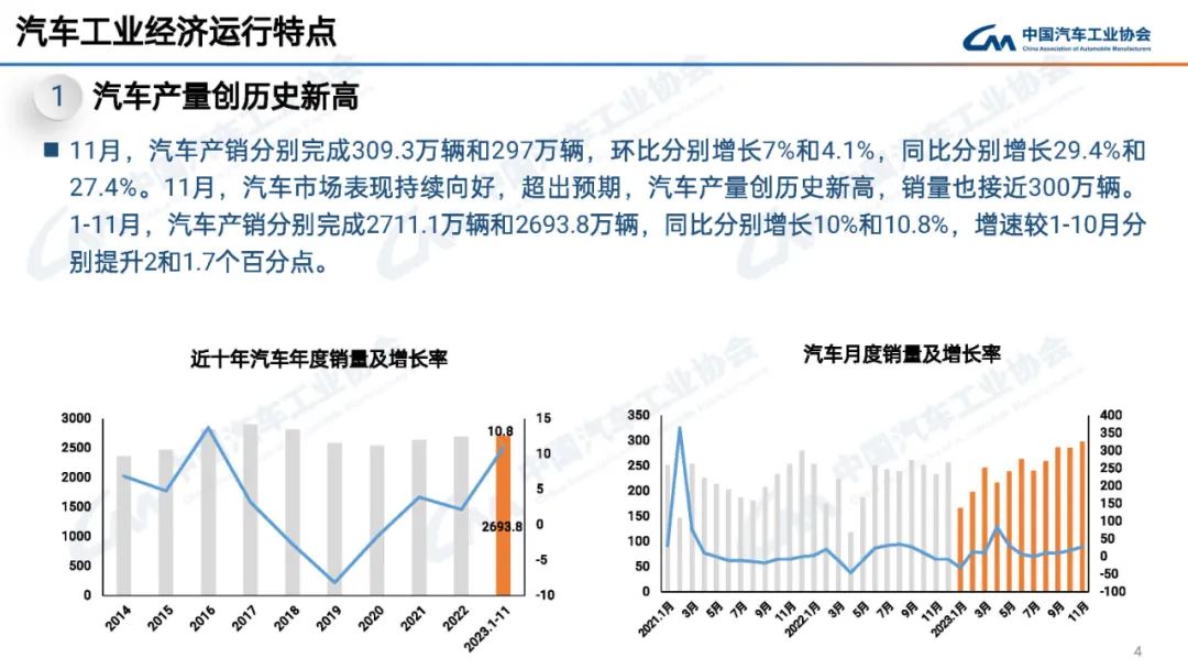 1-11月,汽車產(chǎn)銷分別完成2711.1萬輛和2693.8萬輛,同比分別增長10%和10.8%,增速較1-10月分別提升2和1.7個百分點。