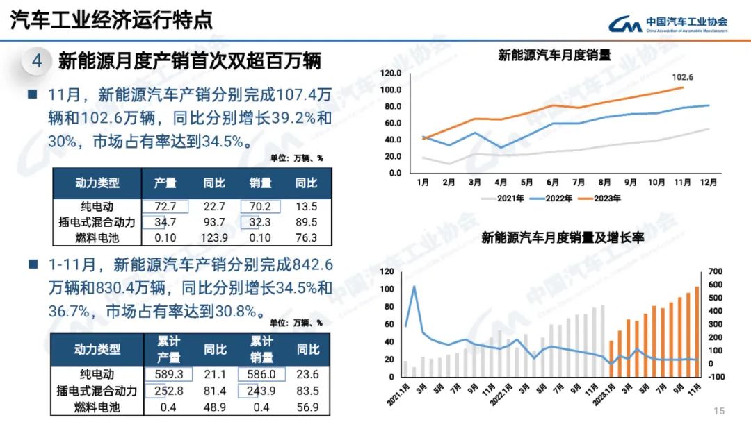 1-11月,新能源汽車產(chǎn)銷分別完成842.6萬輛和830.4萬輛,同比分別增長34.5%和36.7%,市場佔有率達到30.8%。