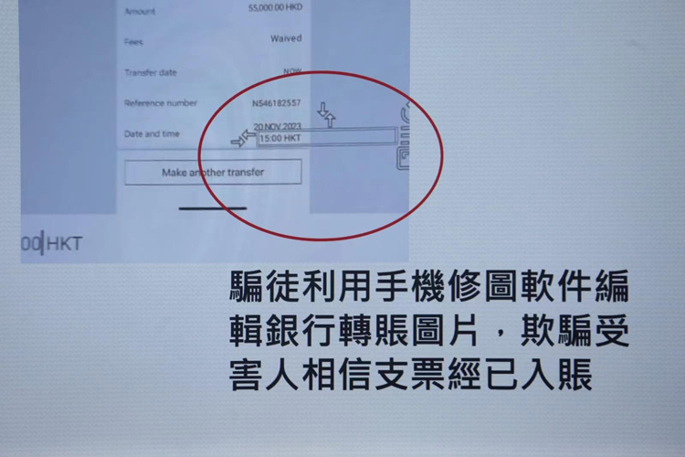 騙徒透過(guò)櫃員機(jī)存入空頭支票假裝已轉(zhuǎn)賬,再派人進(jìn)行交收。受害人在網(wǎng)上銀行檢查交易紀(jì)錄,誤以為騙徒已經(jīng)過(guò)數(shù),於是將貨物交給騙徒。案中發(fā)現(xiàn)騙徒訛稱(chēng)轉(zhuǎn)賬時(shí)不小心給予過(guò)多金錢(qián),要求受害人將差額歸還,受害人不虞有詐,導(dǎo)致二次損失。完成交收後受害人就收到銀行通知,表示該筆轉(zhuǎn)賬無(wú)效始知受騙。