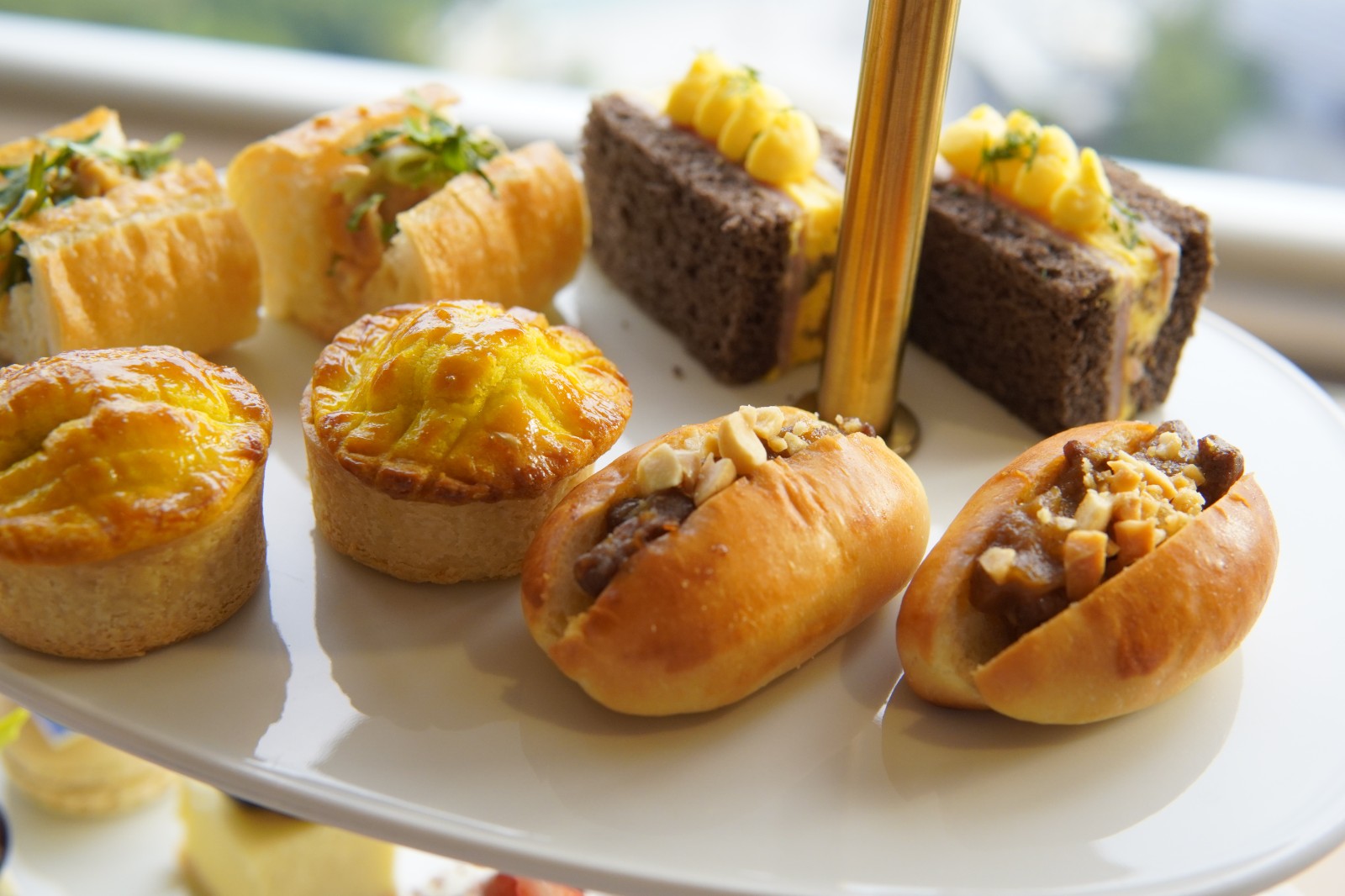 下午茶的鹹點(diǎn)充滿了港式情懷,菠蘿叉燒撻是師傅選用3款常見(jiàn)的港式點(diǎn)心為靈感創(chuàng)作,外層是酥脆香甜的菠蘿麵包酥皮,內(nèi)裏是惹味的蜜汁叉燒內(nèi)餡,配以脆香鬆化的撻底,重新演繹了數(shù)款港式點(diǎn)心。沙嗲牛肉包結(jié)合了茶餐廳經(jīng)典美食的精華,牛肉鮮嫩多汁,配以香辣沙嗲醬汁和鬆軟麵包,味道濃厚,鹹香十足。酒樓食肆常見(jiàn)的炸蝦春卷香脆可口,外層炸得金黃酥脆,包裹彈牙的蝦仁及蝦蓉,春卷下鋪了清新沙律,清爽解膩。