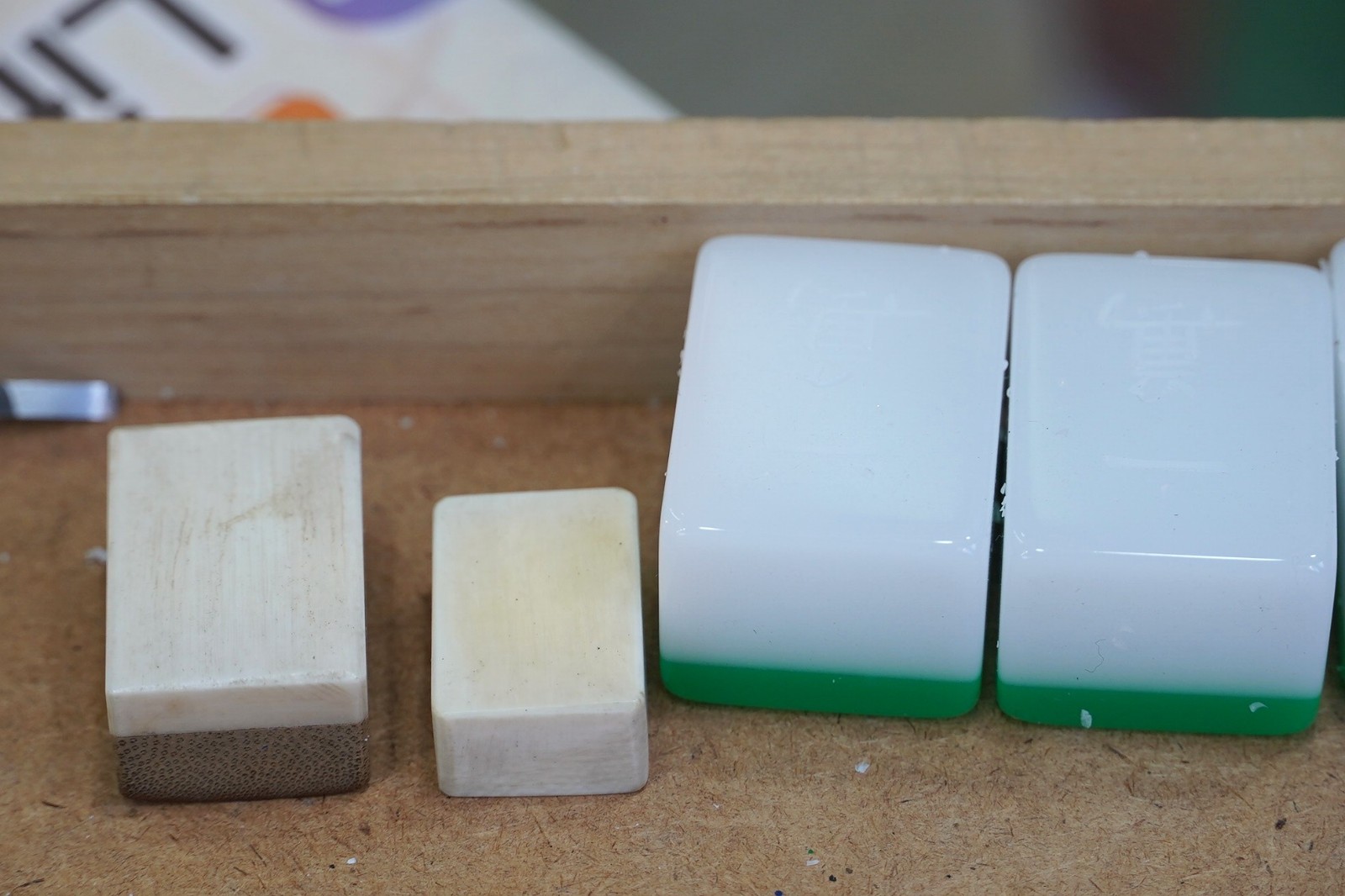 現(xiàn)時(shí)的麻雀一般使用亞加力膠為原料製作(右一及二)。早期則以竹製(左一)及象牙製(左二)為主,手感各有不同。