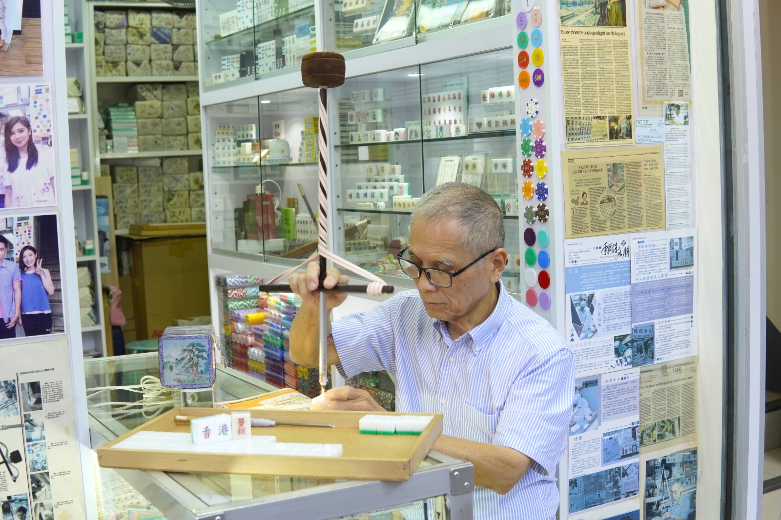 從風(fēng)華正茂的少年,到今天白髮蒼蒼的老人,景叔年輕時(shí),最高峰一日能雕製兩三套麻雀,如今,花費(fèi)4至5日才雕好一套,他依然十年如一日地默默耕耘,每日工作12小時(shí)。日常除了埋首工作枱雕刻麻雀,景叔還開(kāi)設(shè)工作坊傳授技藝,「近10年,有更多年輕人留意傳統(tǒng)手藝,也有機(jī)構(gòu)邀請(qǐng)我開(kāi)班授課,傳授手雕麻雀基本工藝?!孤槿概蒲u作技藝屬於香港非遺清單項(xiàng)目,景叔不忍心看見(jiàn)這門(mén)手藝失傳,所以再忙也會(huì)抽出時(shí)間主持工作坊,今年11月就開(kāi)設(shè)了8班。他曾經(jīng)在課堂上遇過(guò)天賦特別高的學(xué)生:「幾年前,有一位外國(guó)人來(lái)上課,他一邊喝酒一邊學(xué)雕麻雀,因此我印象特別深刻。他表現(xiàn)有些輕浮,但第一次雕刻漢字竟然頗有風(fēng)骨韻味,雖知道老外書(shū)寫(xiě)漢字,一般也歪歪扭扭,但他卻雕得很好,我甚至懷疑他帶了別人預(yù)早雕好的麻雀來(lái)。後來(lái)這位老外的華人朋友特意來(lái)店舖,買(mǎi)了一套我親自雕刻的麻雀作禮物送給這個(gè)向我學(xué)藝的老外,以示鼓勵(lì)?!箲浧疬@件往事,景叔流露出笑容,似是因?yàn)橛腥诵蕾p他的手藝而感到滿意。