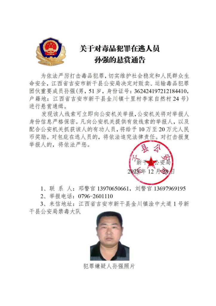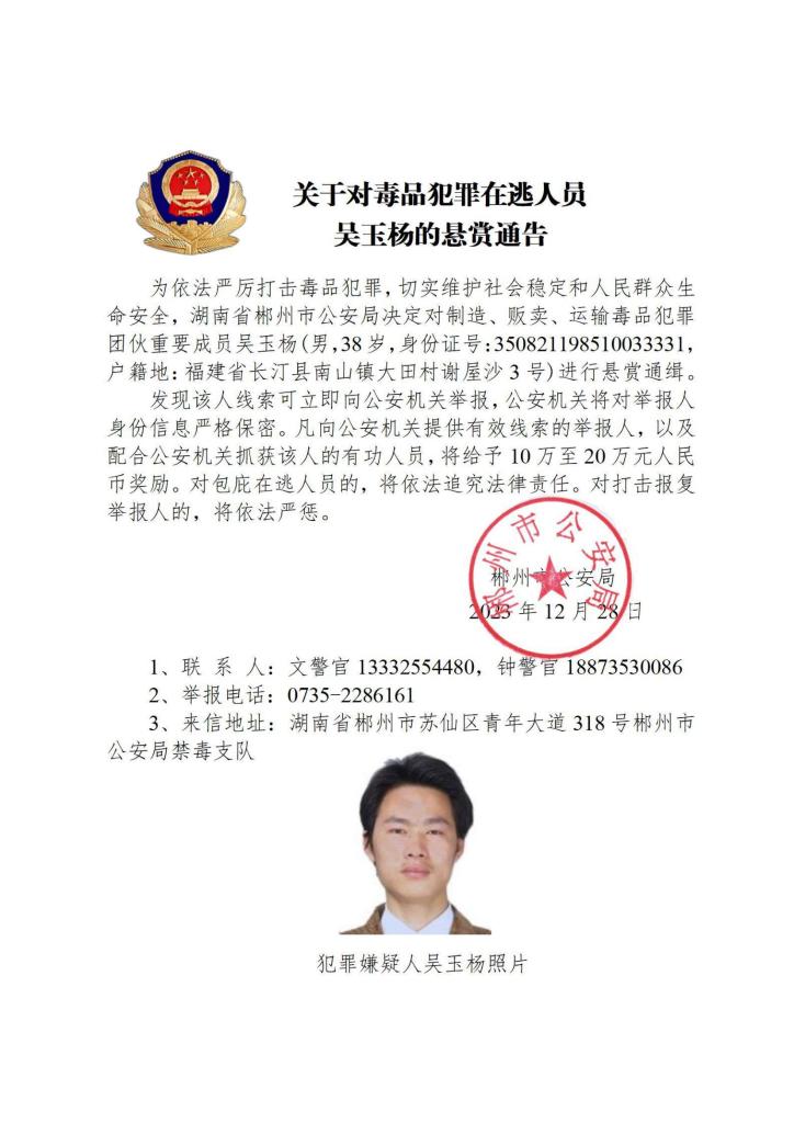 其中,湖南省郴州市公安局決定對張安龍、馬文祥、吳玉楊進(jìn)行公開懸賞通緝;湖南省株洲市公安局決定對楊金梅進(jìn)行公開懸賞通緝;江西省新幹縣公安局決定對曾小勇、李國平、孫強(qiáng)進(jìn)行公開懸賞通緝;浙江省溫州市公安局決定對顏歡平進(jìn)行公開懸賞通緝;四川省遂寧市公安局決定對母朝東進(jìn)行公開懸賞通緝;貴州省黔東南州公安局決定對龍華進(jìn)行公開懸賞通緝。