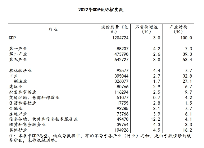 國家統(tǒng)計(jì)局:經(jīng)最終核實(shí),2022年GDP現(xiàn)價(jià)總量為1204724億元