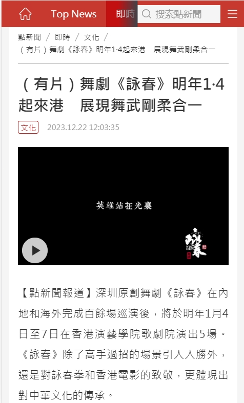 《巴士的報(bào)》去年11月刊登的一篇文章,作者在深圳觀看了舞劇《詠春》,表示演出下半場五大門派「過招」引發(fā)全場熱烈掌聲,直呼「這一段高潮迭起、令人目不暇接,每一秒都是『精華』」。作者認(rèn)為《詠春》的創(chuàng)新很值得香港學(xué)習(xí),亦在當(dāng)時就非常希望《詠春》能來香港演出,希望透過香港這個中外文化藝術(shù)交流中心,讓世界更多人認(rèn)識我們中國舞臺劇已走在世界級數(shù)。
