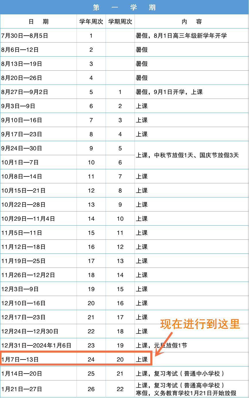 ●第一學(xué)期第1周為2023年8月27日至9月2日,開學(xué)時間為9月1日;寒假開始時間為2024年1月21日;