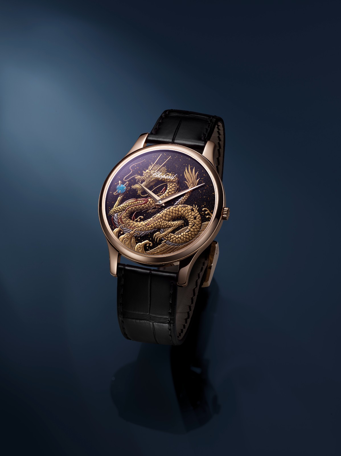 製表時(shí),金藝與漆藝相互融匯相當(dāng)難得,能夠嫻熟掌握這門技藝亦是少有。蕭邦以日本傳統(tǒng)蒔繪工藝呈現(xiàn)神話的祥龍,慶祝農(nóng)曆新年,L.U.C XP龍年蒔繪腕表象徵機(jī)遇與興旺。祥龍是中國神話傳說中最早出現(xiàn)的瑞獸,代表皇權(quán)、財(cái)富與繁盛,亦是吉祥的象徵。腕表從中國傳統(tǒng)文化汲取靈感,採用18K玫瑰金打造的39.5毫米直徑表殼,搭載配備微型擺陀的L.U.C 96.17-L型機(jī)芯,確保腕表厚度不超過6.8毫米。表盤採用日本傳統(tǒng)蒔繪工藝?yán)L製,點(diǎn)綴金粉與以珍珠貝母鑲嵌的圖案裝飾,並且於日本手工繪製完成。