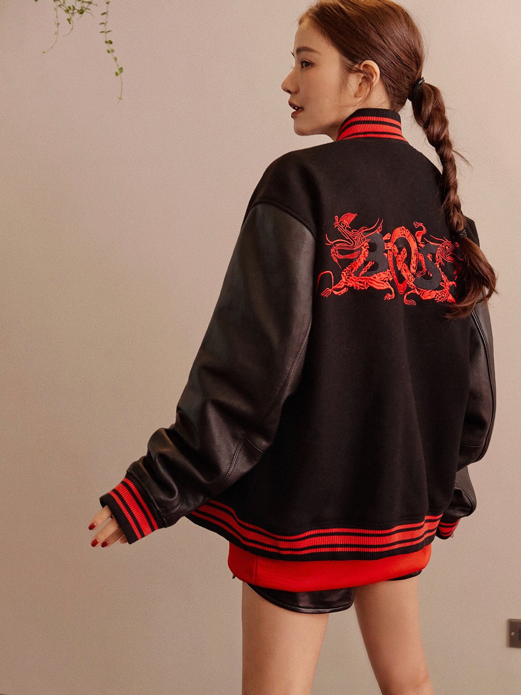 BOSS攜小說家、書法藝術(shù)家馮唐,打造以傳統(tǒng)書法為靈感的龍年限定系列。系列靈感源自漢字和東方傳統(tǒng)圖案,書寫出富現(xiàn)代感的字體「龍」,雙龍穿璧紋樣與品牌標(biāo)識結(jié)合,氣勢磅礴,馮唐手書的《洛神賦》字帖和多幅書法作品亦貫穿於此系列。系列以經(jīng)典紅黑配色為主色調(diào),以米白色點(diǎn)綴,包含經(jīng)典廓形的學(xué)院風(fēng)棒球外套、休閒運(yùn)動(dòng)衫、針織衫和T恤等一系列中性單品。其中,皮革和羊毛混紡學(xué)院風(fēng)棒球外套玩轉(zhuǎn)材質(zhì)拼接,點(diǎn)綴龍字圖騰貼飾,結(jié)合書法內(nèi)襯重新詮釋這一外套。