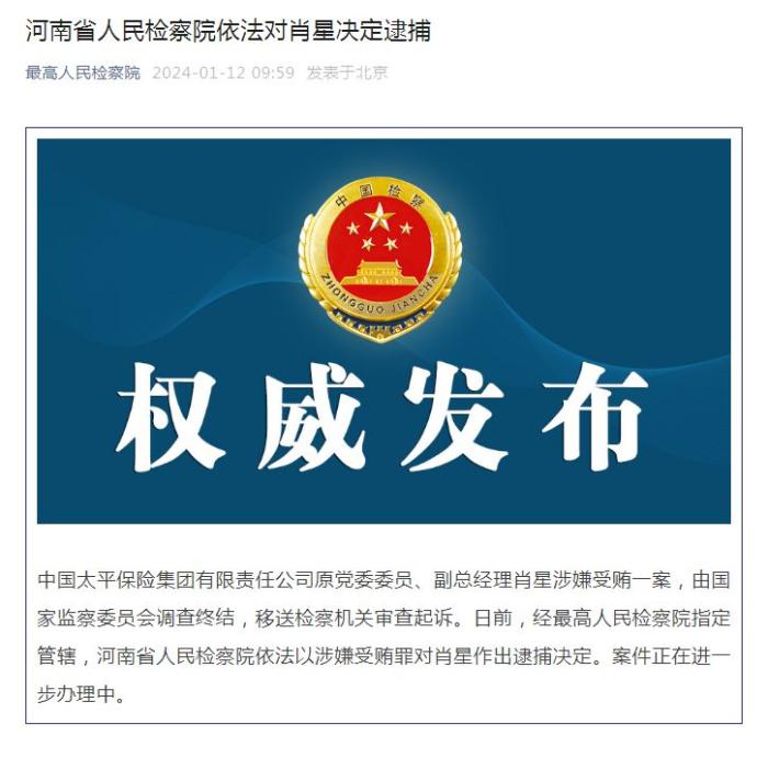 據(jù)最高人民檢察院微信公眾號消息,中國太平保險集團有限責任公司原黨委委員、副總經(jīng)理肖星涉嫌受賄一案,由國家監(jiān)察委員會調查終結,移送檢察機關審查起訴。日前,經(jīng)最高人民檢察院指定管轄,河南省人民檢察院依法以涉嫌受賄罪對肖星作出逮捕決定。案件正在進一步辦理中。