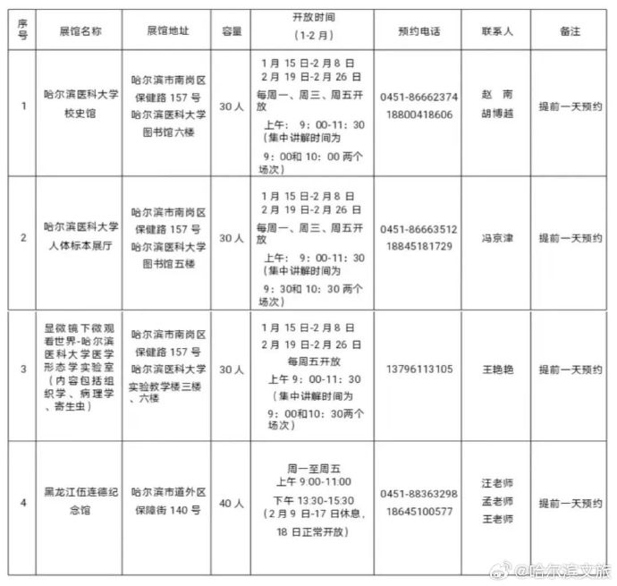 除了哈藥六廠,2024年1月15日至2024年2月26日,哈爾濱醫(yī)科大學(xué)亦對外開放,遊客們可以打卡校史館、人體標(biāo)本展廳、形態(tài)學(xué)實驗室和伍連德紀(jì)念館,具體開放情況見下表。