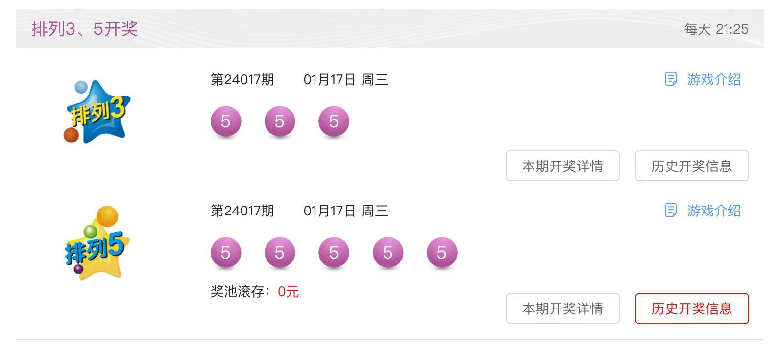 17日,中國體彩最新開獎結(jié)果出爐,其中排列3和排列5均出現(xiàn)罕見的「連五」組合。體綵排列3的開獎號碼為「555」,排列5的開獎號碼為「55555」。據(jù)中國體彩網(wǎng)公布的信息顯示,排列5的一等獎中獎注數(shù)為5966注,獎池被清零。