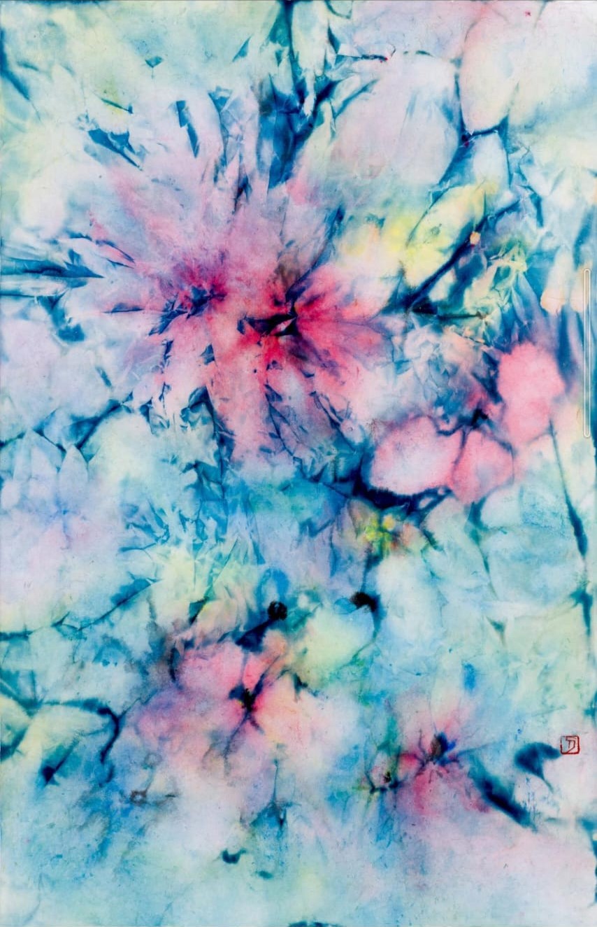 藍色向來予人純淨、自然的印象,如天空、海洋,讓人心馳神往。對於藝術(shù)家刁綺蓮來說,藍印的藍色給她療癒的感覺。她對記者表示,自己2023年開始運用藍印顯影液製作顯影紙,並用上如宣紙、水彩紙、描圖紙等不同質(zhì)料作試驗:「我把顯影液體代替墨汁畫在紙上,加上不同媒材增加畫面效果,再利用UV燈照射製作作品。部分作品尺幅較大,闊約2米,需要放在戶外曬太陽,利用紫外光將作品顯影?!拐纭柑鞖獠凰祁A(yù)期」,刁綺蓮無法預(yù)測藍曬產(chǎn)生的作品,因此沖洗及過定色劑固定作品顏色後,她會再加上水墨顏料,令作品更氣韻生動。