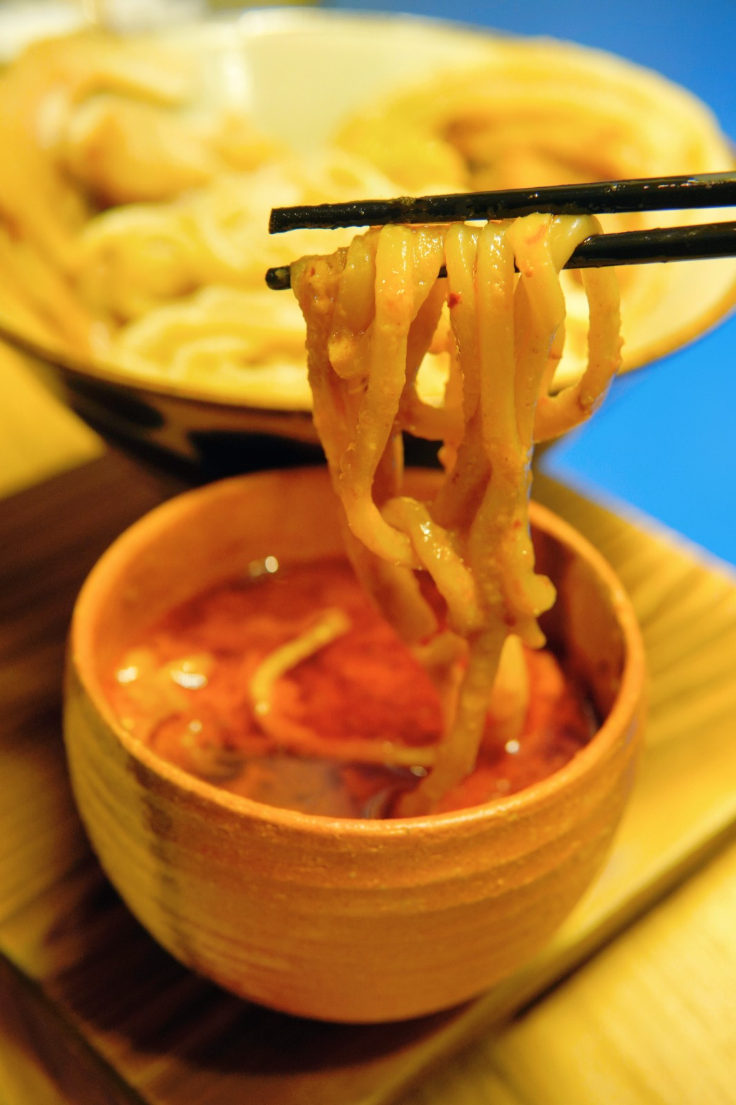 嗜辣者推介「火炙豚肉擔(dān)擔(dān)沾麵」,粗麵條選用日本小麥粉製作,濃郁的雞白湯與芝麻味噌醬熬製而成的沾麵醬汁相結(jié)合,風(fēng)味獨(dú)特。芝麻味噌醬的芝麻經(jīng)輕微烘焙、多次磨碎,展現(xiàn)香氣和順滑口感,同時(shí)用上京都、德島及信州多地味噌,調(diào)配出複雜有致的味噌。沾麵搭配3片火炙豚肉叉燒,以北海道十勝豚梅頭肉經(jīng)低溫?zé)h製四小時(shí)而成,脂肪比例均勻、肉質(zhì)鮮嫩,加入甜辣京蔥作點(diǎn)綴。把麵吃完後,剩下的沾湯可加上豆乳製成「湯割」享用,以沾湯、豆乳約一比一的比例混合,充分品味稀釋後的湯底滋味。