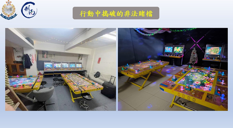 在打擊非法賭博方面搗破兩個非法釣魚機賭檔及兩個非法麻雀檔,均設(shè)於住宅大廈,拘捕20人,檢獲13部釣魚遊戲機、多張電動麻雀枱、其他賭具及賭款。另外,拘捕12人涉嫌販運危險藥物及藏毒,檢獲可卡因、冰毒、氯胺酮、海洛英及大麻,總值300萬元。行動期間偵破多宗嚴重及暴力案件,包括傷人、意圖搶劫而襲擊及非法禁錮等,拘捕多名黑社會成員。