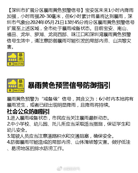 據(jù)深圳市氣象臺(tái)消息,寶安區(qū)未來(lái)1小時(shí)內(nèi)降雨加強(qiáng),小時(shí)雨強(qiáng)20-30毫米,但6小時(shí)累計(jì)雨量將達(dá)到暴雨,深圳市氣象臺(tái)2024年05月21日13時(shí)45分將分區(qū)暴雨黃色預(yù)警信號(hào)擴(kuò)展至上述區(qū)域,全市處?kù)侗┯杲鋫錉顟B(tài)。目前寶安、南山、福田、龍華、羅湖、龍崗西部、珠江口和深圳灣暴雨黃色預(yù)警信號(hào)生效中,請(qǐng)注意防禦暴雨可能引發(fā)的局部?jī)?nèi)澇、山洪等災(zāi)害。
