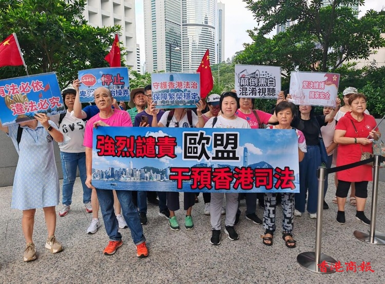 另一邊廂,約20名自發(fā)組織的市民亦到歐盟駐港辦事處抗議。其中一名民歐先生表示,《立場(chǎng)新聞》頑固抱持反中亂港立場(chǎng),不斷發(fā)表缺乏客觀事實(shí)依據(jù)的文章,意圖挑動(dòng)公眾情緒,煽動(dòng)市民敵視中央和特區(qū)政府,性質(zhì)惡劣。香港法院對(duì)該機(jī)構(gòu)及人員依法懲處,是維護(hù)國(guó)家安全、捍衛(wèi)香港法治的正義之舉。其他市民則表示,我們香港市民敦促歐盟認(rèn)清事實(shí),停止包庇違法犯罪分子,停止打著新聞自由的幌子干預(yù)香港特區(qū)司法,停止以任何方式干預(yù)香港事務(wù)。香港事務(wù)純屬中國(guó)內(nèi)政,任何外部勢(shì)力都無(wú)權(quán)干涉。任何企圖破壞香港繁榮穩(wěn)定的行為都不會(huì)得逞。(撰文 / 攝影:李銘欣)