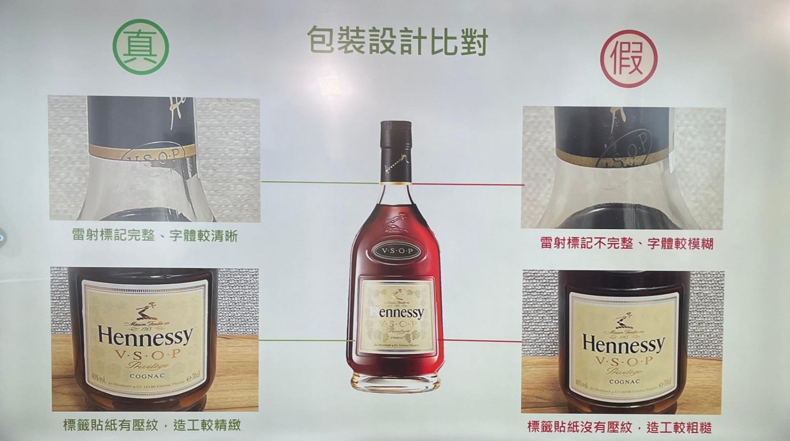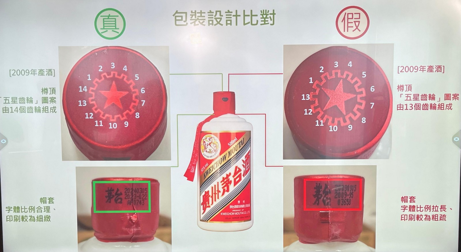 案中檢獲的冒牌烈酒在包裝設(shè)計和價錢與正貨酒有分別,當(dāng)中茅臺酒正貨在不同年份生產(chǎn)設(shè)計細(xì)節(jié)略有不同,如2009年生產(chǎn)的樽頂是五星齒輪圖案,由14格齒輪組成,而冒牌酒只有13格;另外在樽頂正貨印有「茅臺」,字體合理,印刷細(xì)緻,冒牌酒則字體拉長,比例不合理和印刷粗疏。另一款烈酒樽頸印有雷射標(biāo)記,冒牌酒標(biāo)記印刷則深淺不一,正貨酒印刷完整,深淺程度合理,樽身位置有標(biāo)籤貼紙;冒牌酒缺乏壓紋圖案,正貨酒除有壓紋圖案外印刷精細(xì)。