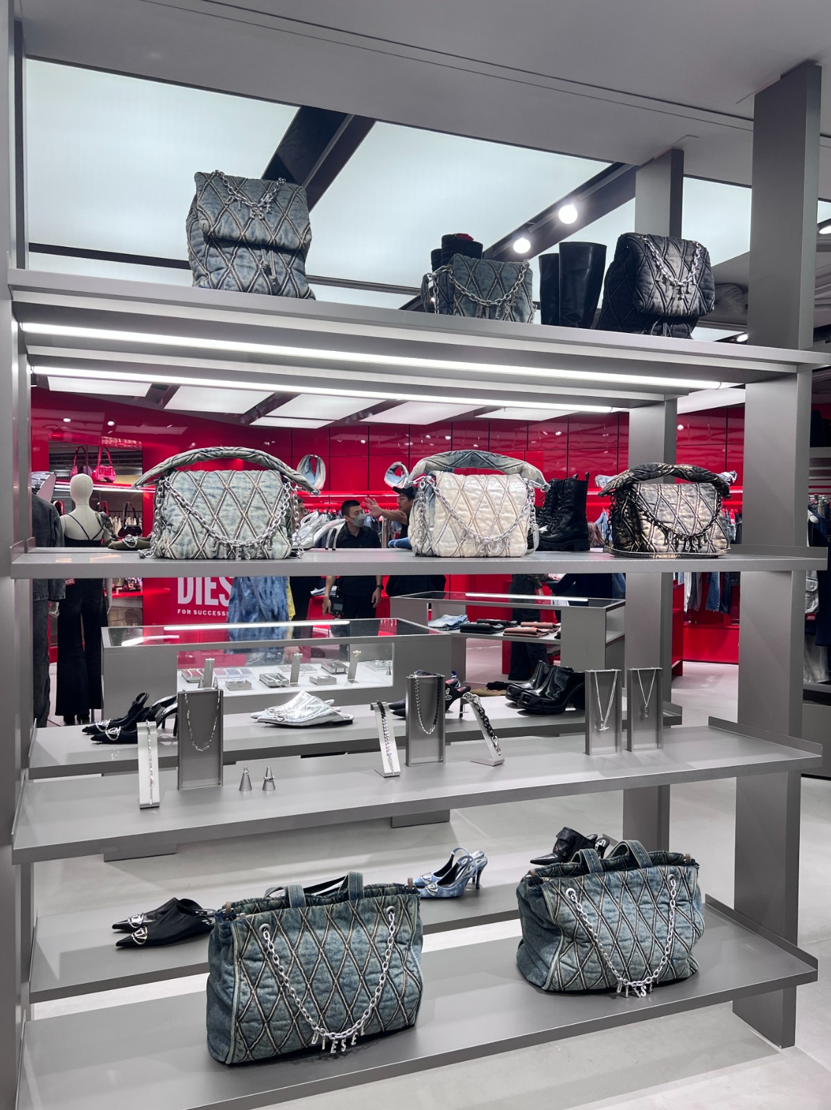 新店齊備品牌多個系列,包括標(biāo)誌性的牛仔褲系列、男裝、女裝、鞋履、配飾及各款手袋,包括經(jīng)典1-DR手袋及絎縫牛仔Charm-D手袋。Charm D手袋以經(jīng)過細(xì)緻處理的牛仔布絎縫製成,凹凸有致的菱格紋手袋袋面飾以閃爍水鑽拼成的品牌字母吊飾,相當(dāng)型格。在2024秋冬時裝展首次亮相的Scrunch-D手袋亦登陸新店,袋上柔軟的皮革圍著鑲於正中間的「D」logo,袋身兩邊則配以拉繩側(cè)袋,造型充滿前衛(wèi)感。