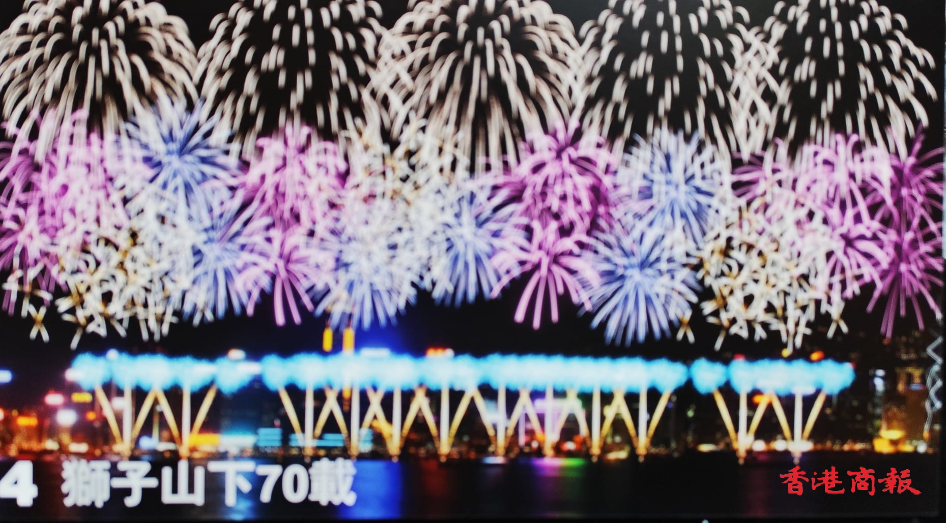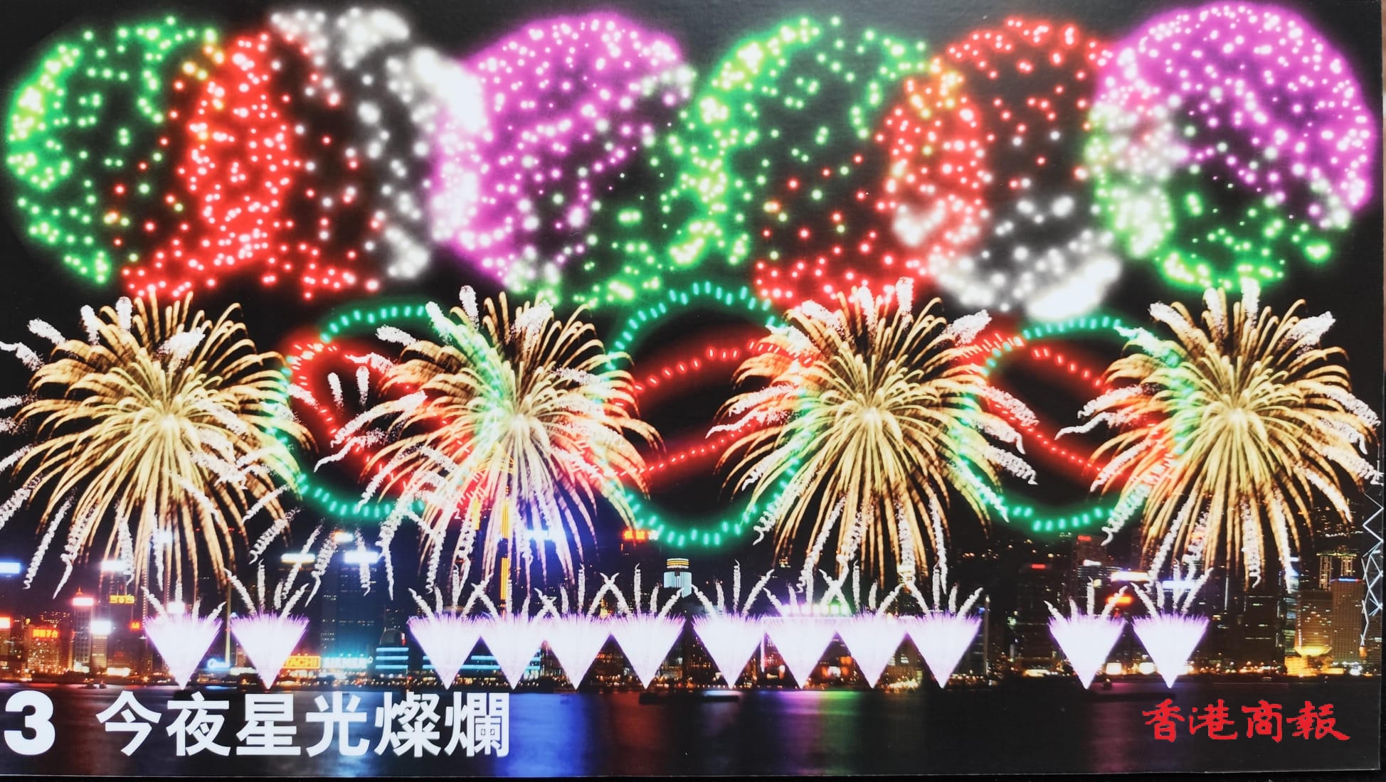 圖為第八幕照片,各種煙花會爭妍鬥麗,在維多利亞港高空綻放。