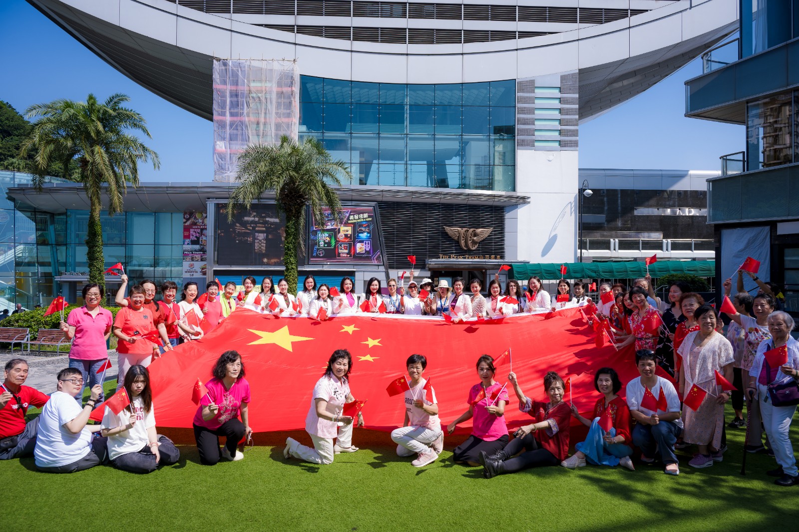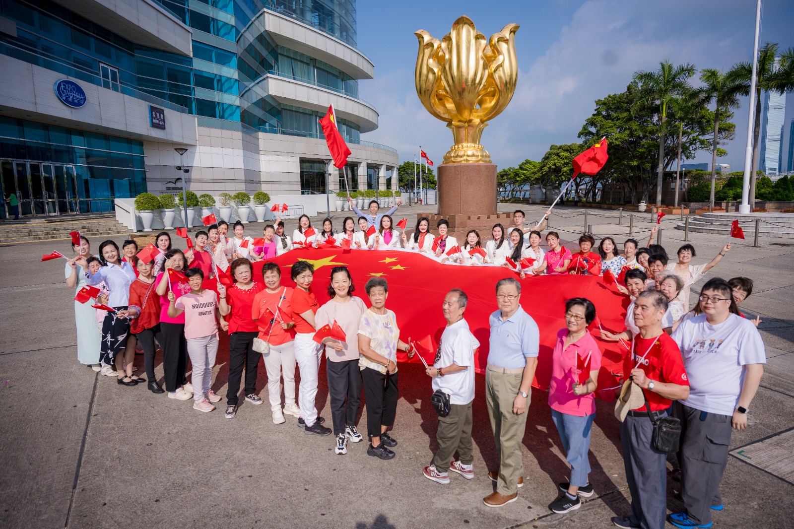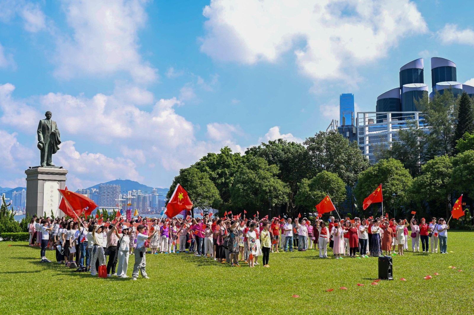 為慶祝中華人民共和國成立75周年,香港島婦女聯會與中西區(qū)民政事務處、香港島各界聯合會婦女事務委員會聯合啓動「龍的傳人- 國旗快閃耀香江」系列活動。主辦方邀數百名市民,穿著旗袍、華服或配合國慶元素的服裝在山頂廣場、金紫荊廣場、中山紀念公園等不同港島地標景點,拍照留念,高唱愛國歌曲,並揮動大型國旗橫幅,以快閃方式,同歡唱、共慶賀,表達對國家的認同、中華兒女的家國情懷和對祖國的祝福。