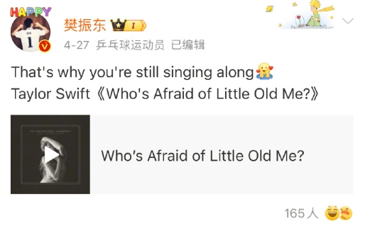 樊振東是流行巨星泰勒·斯威夫特(霉霉)的忠實粉絲,他曾在多個場合公開表明自己的「霉粉」身份。他在巴黎奧運奪得乒乓男單冠軍後,發(fā)布的第一條微博就是分享了「霉霉」的歌曲《The Alchemy》,他在「霉霉」演唱會高聲跟唱的視頻也廣為流傳。