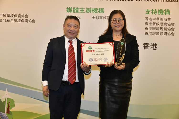 香港環(huán)境保護(hù)協(xié)會(huì)主席樊熙泰教授(左)頒獎(jiǎng)予甘肅安南壩野駱駝國(guó)家級(jí)自然保護(hù)區(qū)管護(hù)中心代表。
