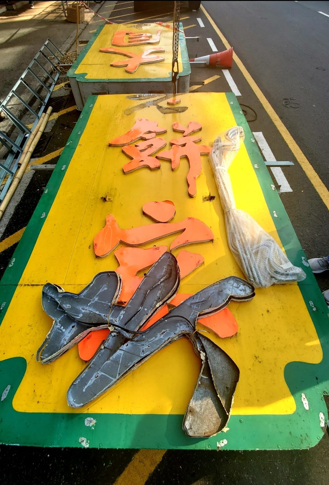 拆卸招牌時(shí)不是每塊均能完整卸下,有時(shí)需要將招牌燈箱拆開,如上圖的「大同老餅家」。(Cardin Chan提供)