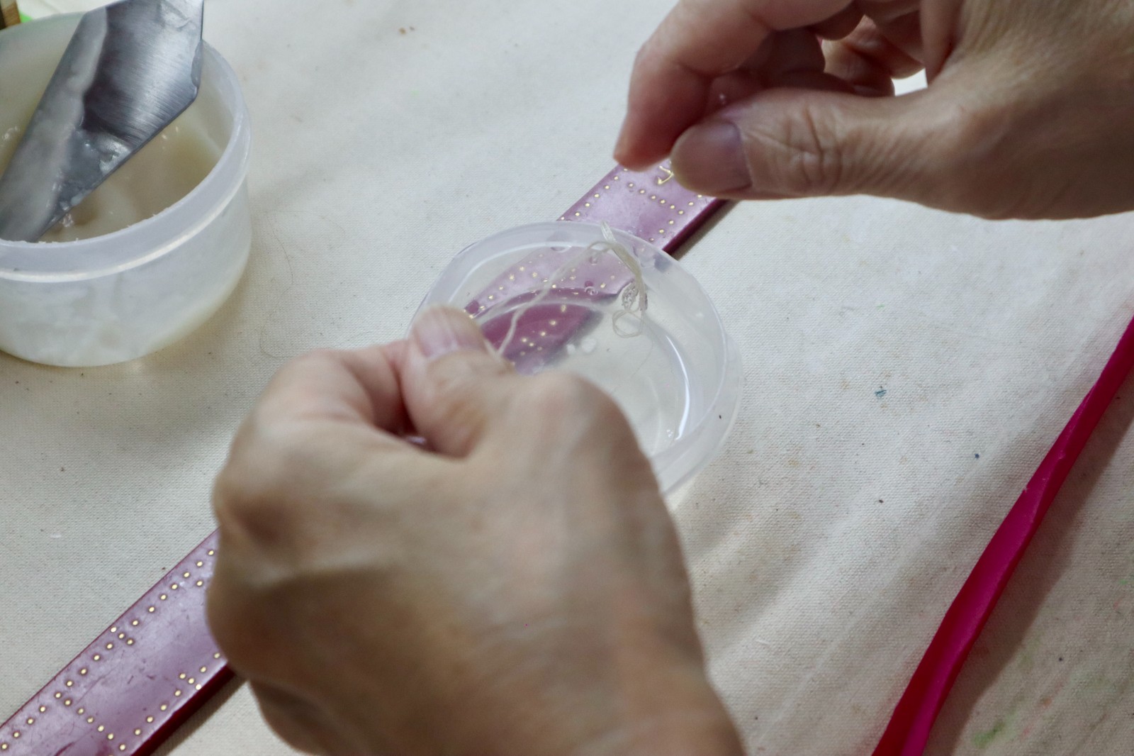 然後用濕線在布條兩邊留下水痕,修整邊沿。