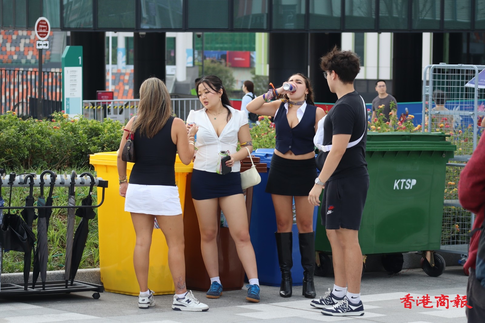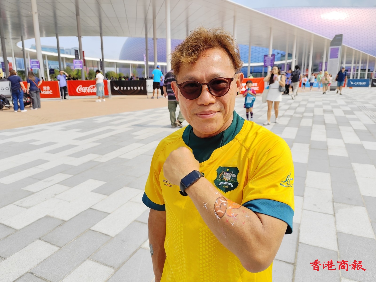 黃先生和吳小姐身穿法國隊球衣和佩帶日本漫畫頭飾前來觀賽。兩人稱佩帶頭飾是因為喜歡有關(guān)角色,而前者最喜歡的球星是Antoine Dupont,但今次未有參賽。他提到以往看過4次香港七人欖球賽,對於賽事第一次移師啟德舉行,覺得氣氛應(yīng)會很好,因場地很大,心情很興奮、期待。吳小姐是第一次觀賞欖球賽,因有黃先生介紹與希望感受一下賽事氣氛。兩人預(yù)計觀賞至晚上8時後會外出進餐,假若球迷村內(nèi)的餐飲攤位售價為每人100元左右都會考慮嘗試。