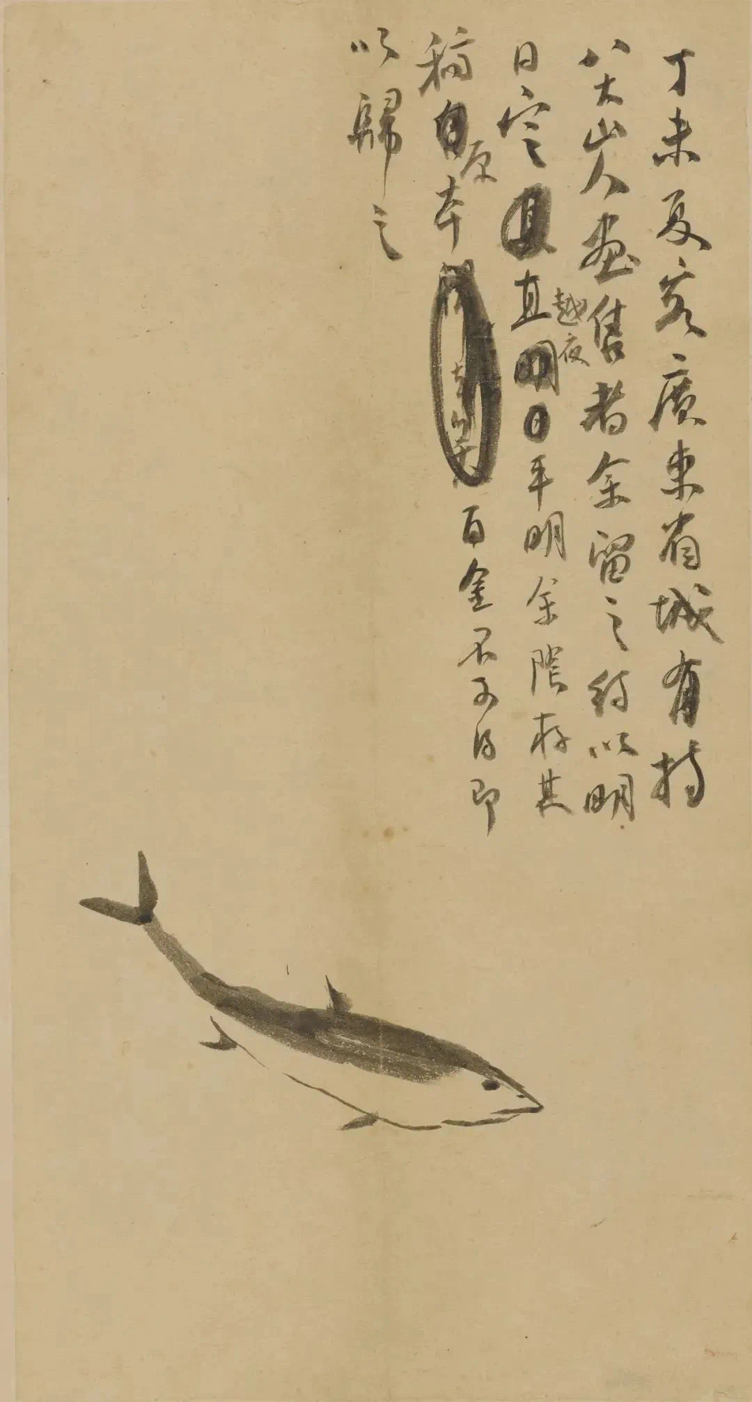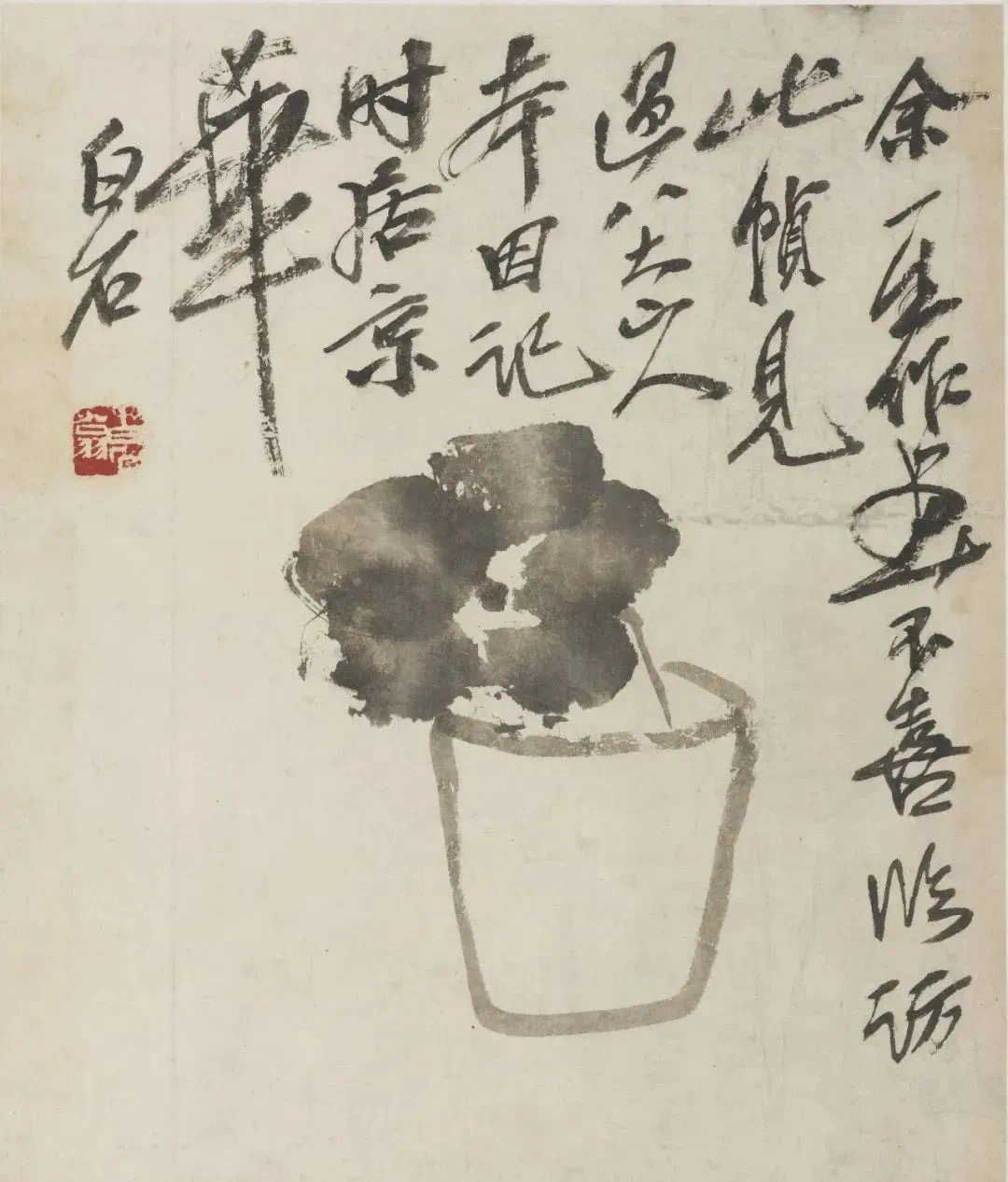 另一側(cè)的齊白石臨清朱耷《瓶花》及《記八大山人畫稿》兩幅作品也頗為引人注目。白石老人還在畫上寫了兩篇「小作文」記錄心路歷程:1907年夏,齊白石客居廣東省城,見(jiàn)街上有人拿著八大山人的畫作在售賣,但是賣「一百金」實(shí)在是太貴了,於是他就悄悄地把這幅作品臨了下來(lái)。他又說(shuō):「餘一生作畫不喜臨仿,此幀見(jiàn)遇八大山人本,因記。」一代大師,就是這樣帶著自己對(duì)八大山人畫作的渴望,向著更高的藝術(shù)層次進(jìn)發(fā)。