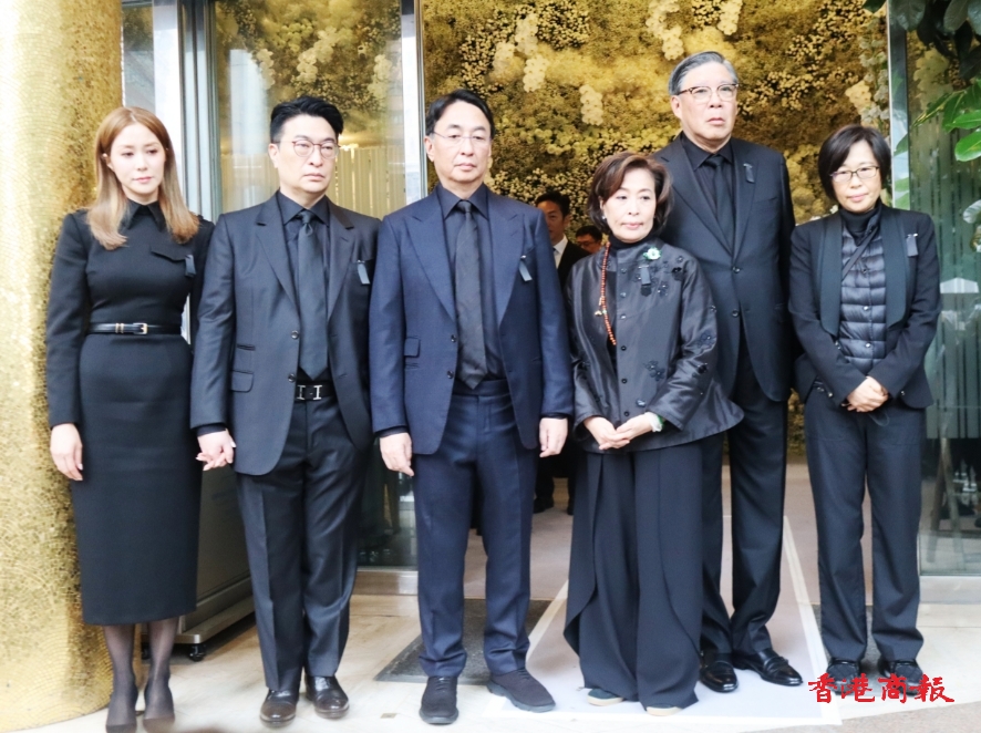 李兆基家人在香港殯儀館外見傳媒。(記者馮瀚文攝)