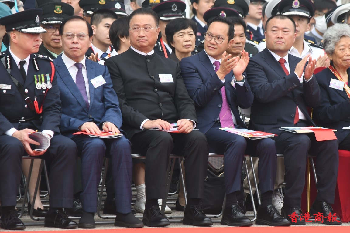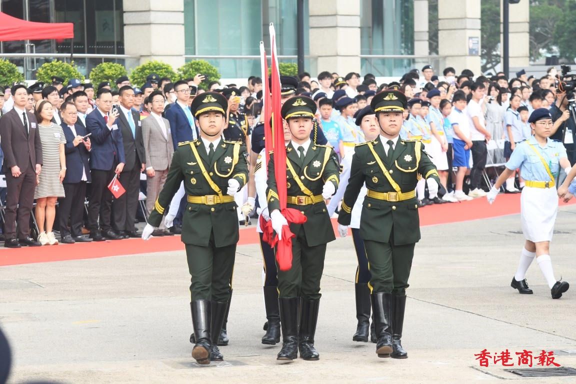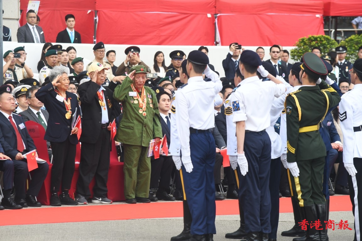 政務司司長陳國基、民政及青年事務局副局長梁宏正、中聯(lián)辦副主任劉光源、外交部駐港特派員公署副特派員潘雲(yún)東、前特首梁振英與太太梁唐青儀、全國人大常委會委員李慧瓊、立法會主席梁君彥,以及多名行會成員、立法會議員出席;3名東江縱隊香港地區(qū)抗日遊擊隊老戰(zhàn)士亦到場觀禮,有1200名青少年制服團隊及中小學生參與活動。