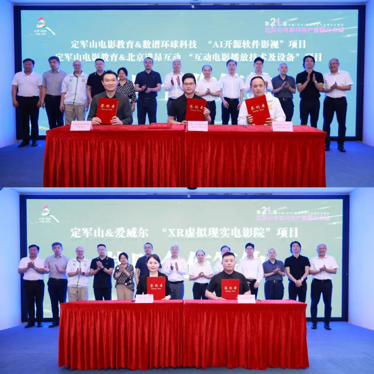 5月23日,第二十一屆文博會(huì)定軍山電影科技產(chǎn)業(yè)園分會(huì)場(chǎng)盛大開幕,開幕式期間,在現(xiàn)場(chǎng)領(lǐng)導(dǎo)和嘉賓的共同見證下,定軍山電影教育科技(深圳)有限公司、數(shù)譜環(huán)球(深圳)科技有限公司、世第(深圳)影視科技有限公司、廣州聚匯意傳媒有限公司、深圳瀚海光通信科技有限公司、北京進(jìn)昂互動(dòng)科技有限公司分別就《AI開源軟件影視項(xiàng)目》、《沉浸式5D動(dòng)感影院項(xiàng)目》、《中小學(xué)影視教育項(xiàng)目》、《人工智能電影AI實(shí)踐室》以及《互動(dòng)電影播放技術(shù)及設(shè)備項(xiàng)目》進(jìn)行合作簽約;定軍山電影公園(深圳)有限公司與愛威爾星空(北京)技術(shù)有限公司就《XR虛擬現(xiàn)實(shí)電影院》項(xiàng)目進(jìn)行合作簽約,促成了若干項(xiàng)重大項(xiàng)目戰(zhàn)略合作。