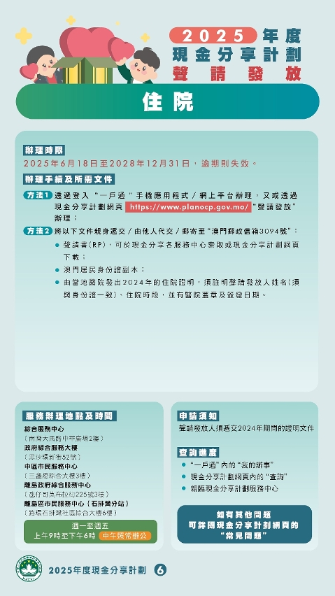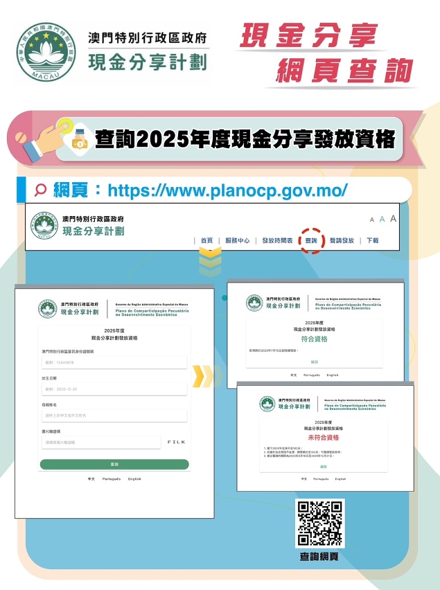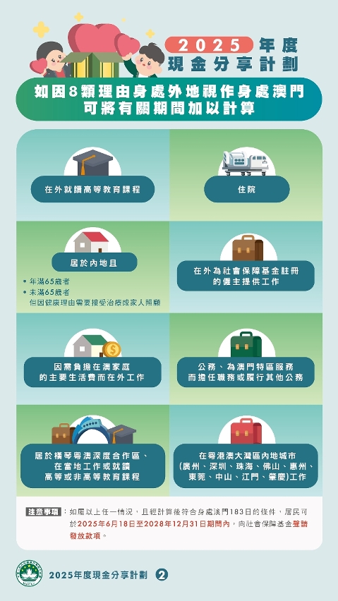 對於初步未符合資格的人士,如在2024年因法定理由身處澳門以外地方,且經(jīng)計算後符合在澳183日的要求,亦可在2025年6月18日至2028年12月31日連同相關(guān)證明文件,透過「一戶通」、現(xiàn)金分享計劃網(wǎng)頁、親身、代交或郵寄(澳門郵政信箱3094號)方式向社會保障基金提出聲請,在審核後如確認符合條件則會獲發(fā)放款項。