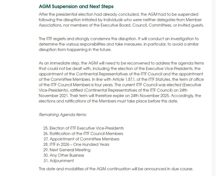 聲明表示,國際乒聯(lián)現(xiàn)階段不會就選舉程序發(fā)表任何進(jìn)一步評論,並將在適當(dāng)?shù)墓艿捞幚硎盏降娜魏握酵对V。作為緊急措施,需要重新召開年度大會,以處理未能完成的議程項(xiàng)目,包括選舉執(zhí)行副主席、任命國際乒聯(lián)理事會各大洲代表以及任命委員會成員。