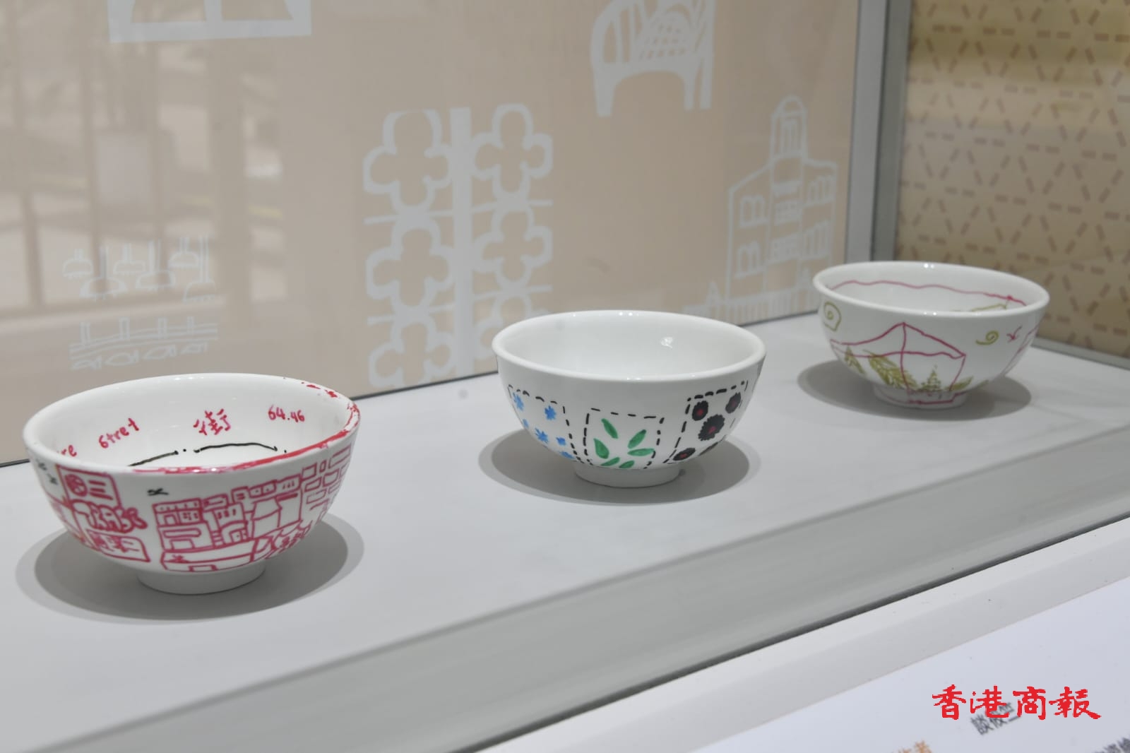 展覽展示建築設(shè)計(jì)團(tuán)隊(duì)、藝術(shù)家和街坊參與「正街上落」項(xiàng)目過(guò)程中提出的意念和構(gòu)想,如學(xué)生在飯碗上畫(huà)出心目中的社區(qū)面貌。記者 蔡啟文攝