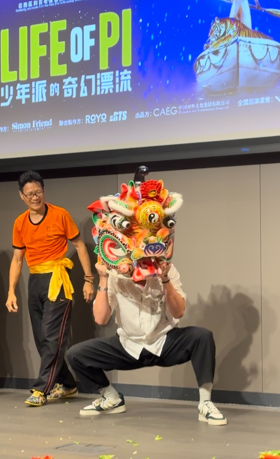 見面會當晚特別安排了「西貢坑口客家舞麒麟」表演。少年派主創(chuàng)團隊亦親身體驗如何舞麒麟?!富⑴紤蛉ぃ梓氤氏椤怪梗屛鞣侥九技妓嚺c本地非遺藝術交匯,碰撞出新的火花。(記者 Alphy 圖片 Alphy、官方提供)