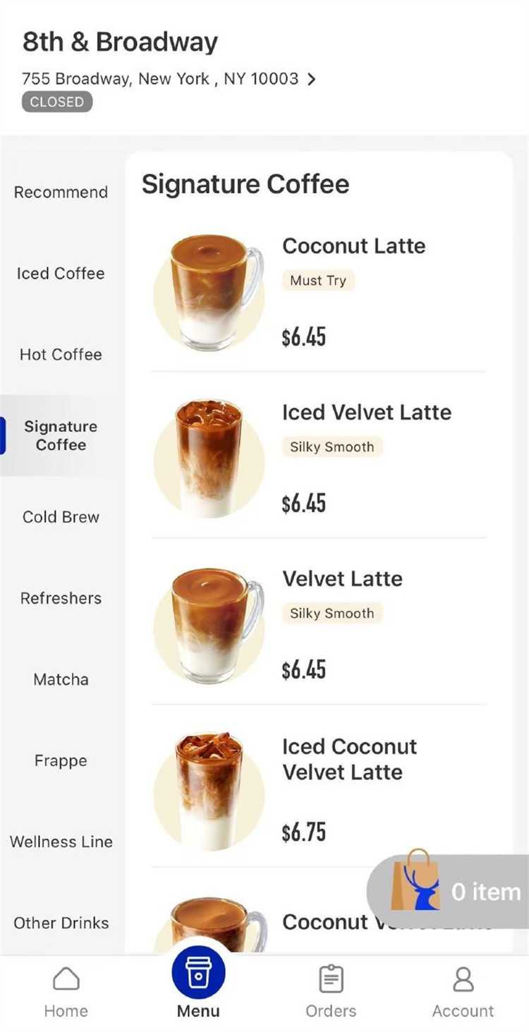 據(jù)瑞幸美國APP公布的菜單顯示,其飲品價格在3.45美元至7.95美元之間。其中最便宜的滴濾咖啡3.45美元、美式咖啡4.45美元、拿鐵5.75美元;生椰拿鐵、絲絨拿鐵定價6.45美元;瑞納冰定價6.75美元,其中最貴的羽衣果蔬飲品定價7.95美元。