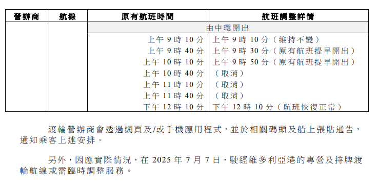 7月7日所有駛經(jīng)維港渡輪服務需臨時調(diào)整服務