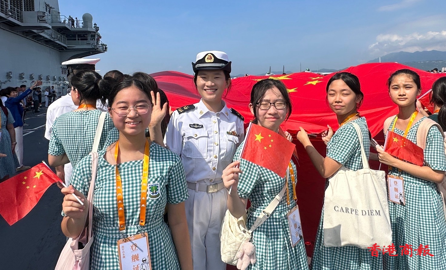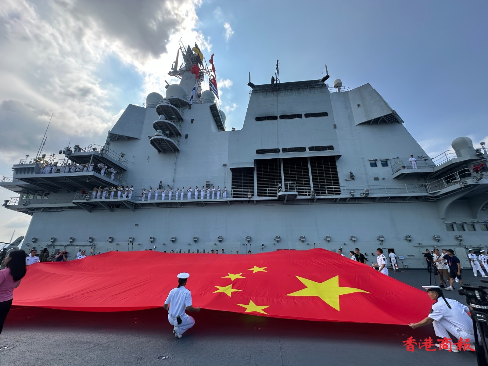 今日(4日)山東艦舉行快閃活動(dòng),艦上官兵和前來參觀的學(xué)生拉開五星紅旗,鋪滿整個(gè)甲板,樂手在艦島上奏起歌曲《我和我的祖國(guó)》,大家都情緒高漲,現(xiàn)場(chǎng)氣氛熱烈。(木子攝)