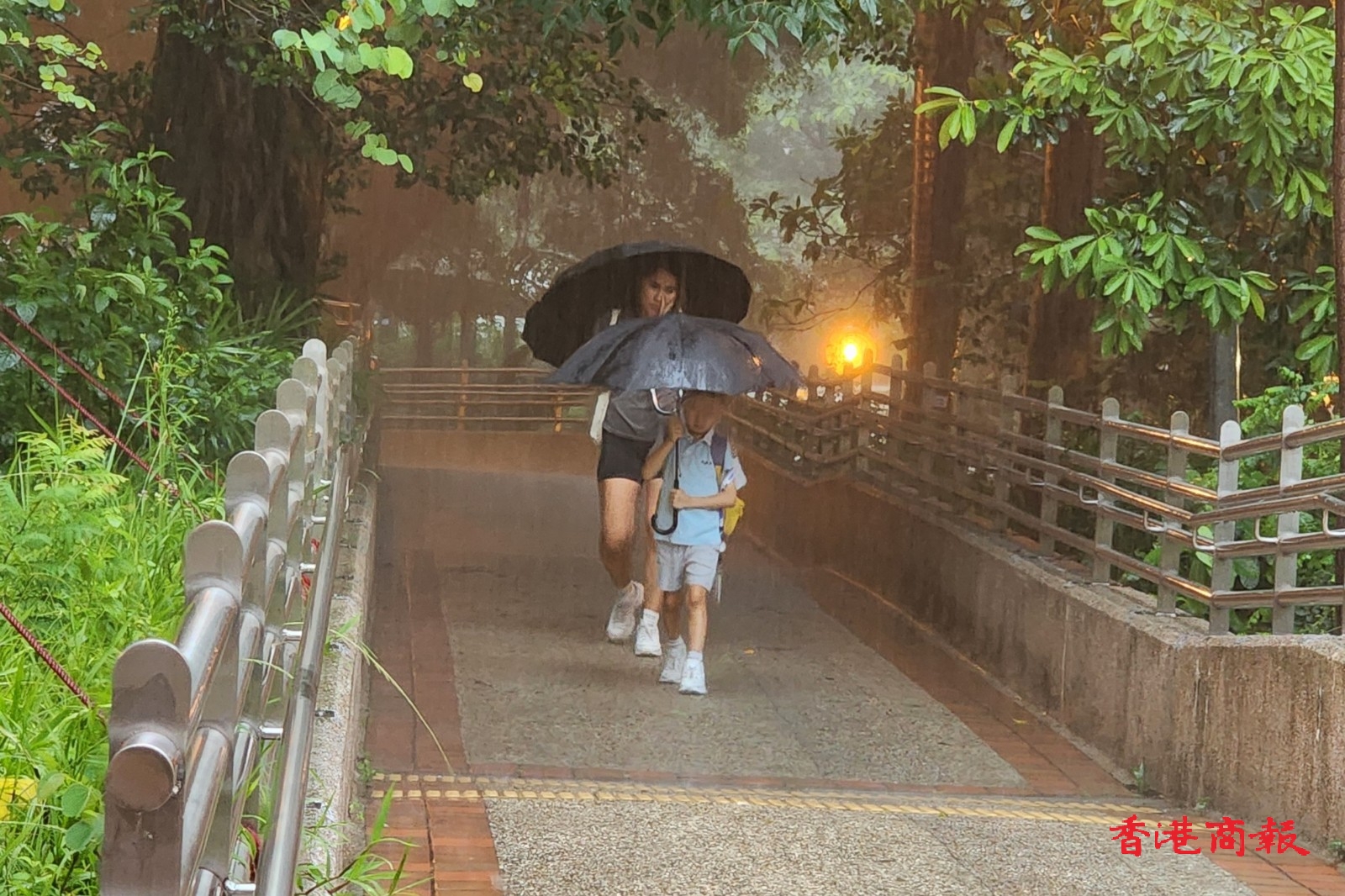 市民及學生在港鐵樂富站外涉水回家或乘車。記者 何家驊攝