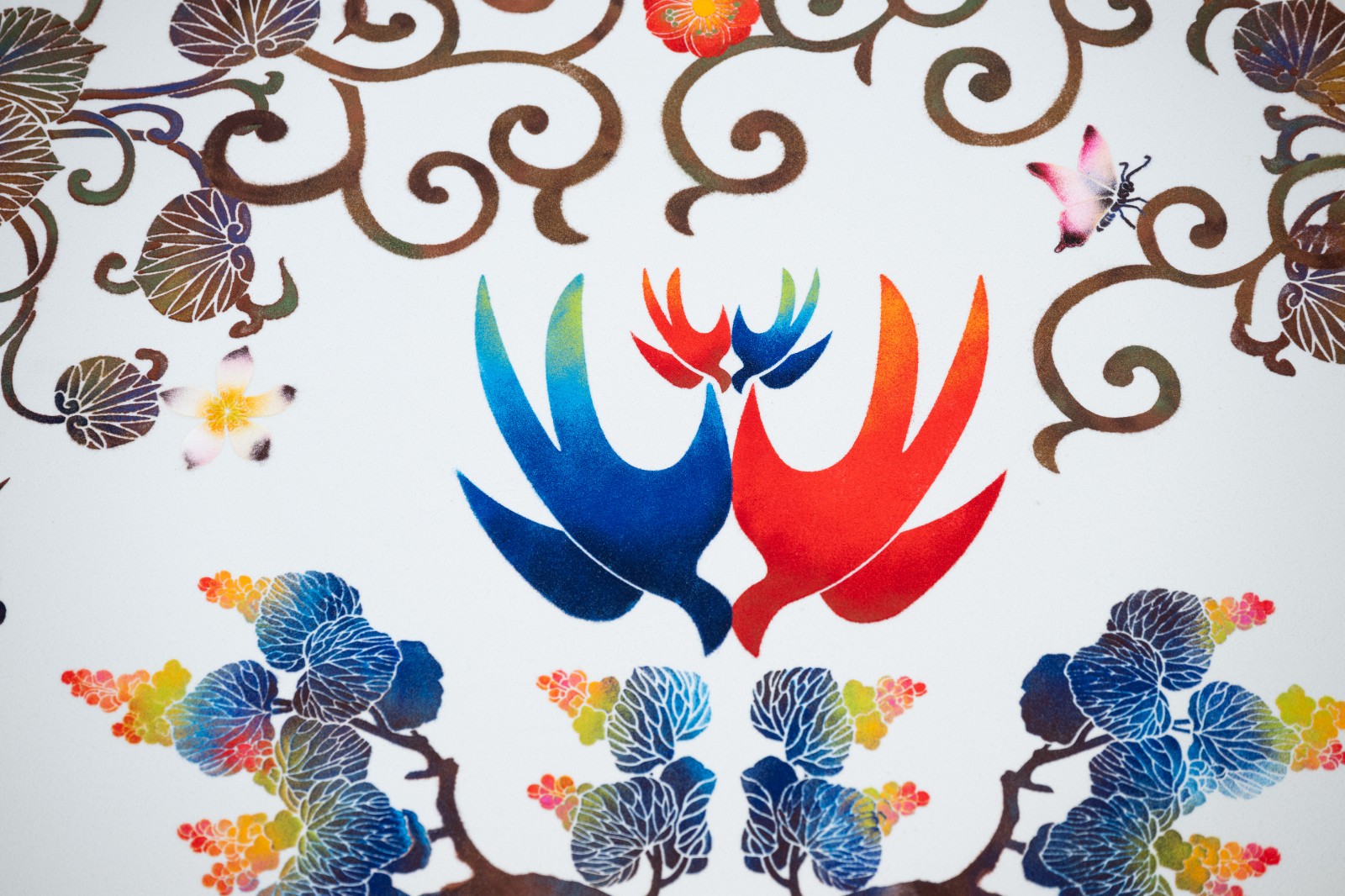 進(jìn)入展廳便能看到藝術(shù)家未完成的巨型作品「光之合奏」,這是持續(xù)進(jìn)?的「迴響無限」系列創(chuàng)作之?。該作品由無數(shù)獨(dú)特的花鳥、蝴蝶,以及象徵性的圖案組成,以彩色礦物質(zhì)粉末堆疊,顏色絢麗多彩。?巻伸嗣在接受香港商報(bào)記者專訪時(shí)表示:「我熱愛烹飪,過去常常接觸各種粉狀材料。那段經(jīng)歷刻在記憶裏,讓我萌生了用粉末作畫的念頭。」他指出,人們作畫通常追求留下永久的痕跡,但粉末畫的美恰恰在於它的短暫易逝。這種轉(zhuǎn)瞬即逝之美令他深深著迷:「我家鄉(xiāng)常下小雪,雪勢不大,零星雪花飄落,在地面淺淺鋪就一層。我格外喜愛那種能看見它留下的痕跡,能捕捉到痕跡的殘餘,隨後又目睹它悄然消逝的感覺。」在他看來,觀察材料自身變化的過程,本身就充滿美感,無比迷人。