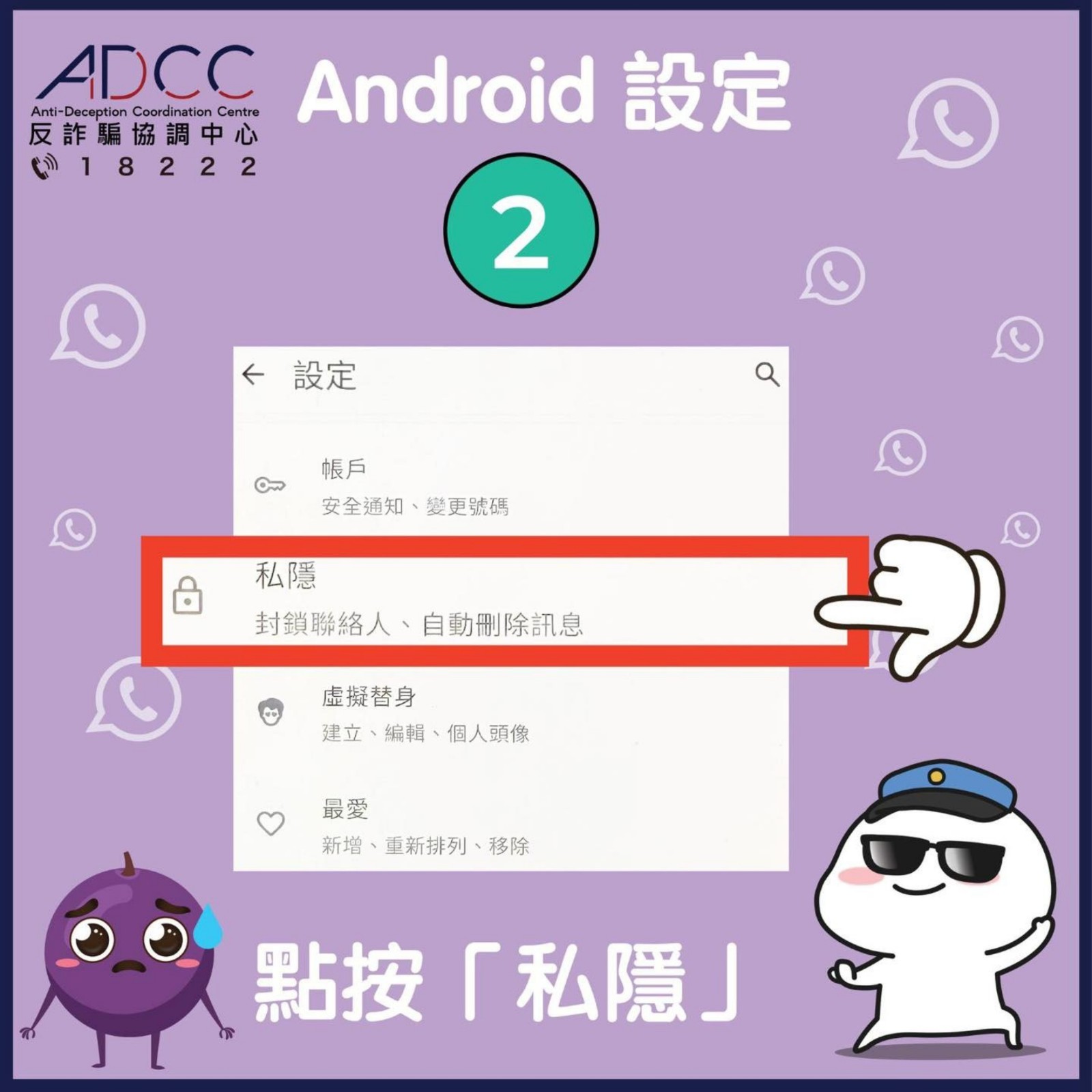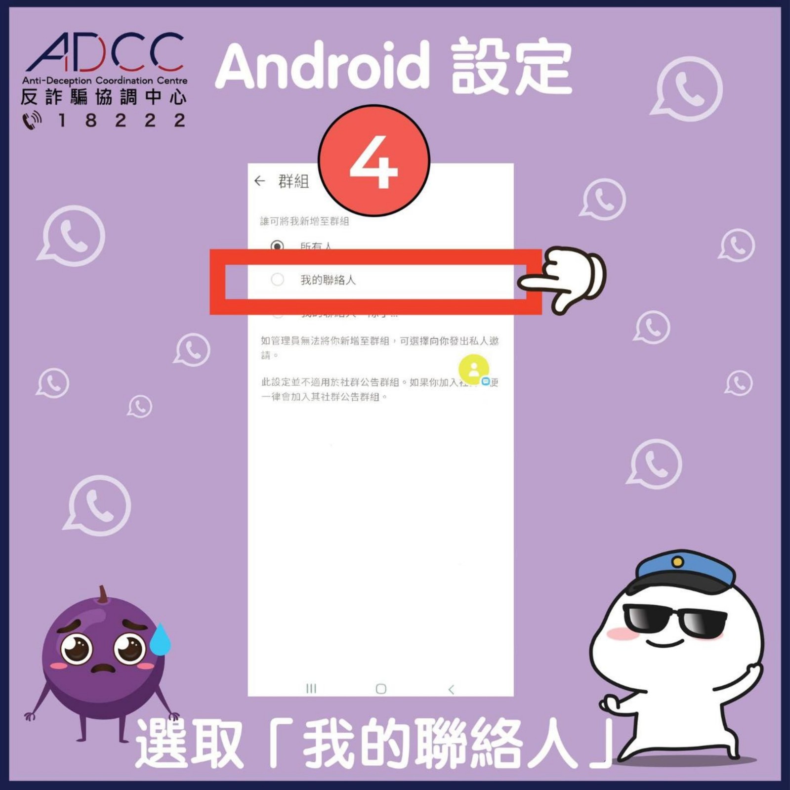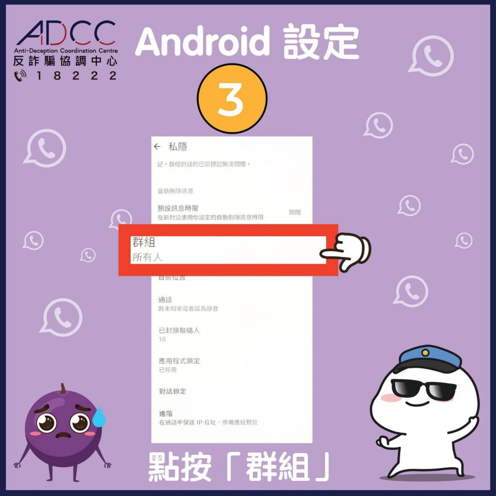 警方提醒,市民可在手機(jī)上WhatsApp程式點(diǎn)按「設(shè)定」、再點(diǎn)按「私隱 > 群組」,選取「我的聯(lián)絡(luò)人」,若彈出提示後按「完成」,以防止「白撞」訊息。(記者 區(qū)天海)