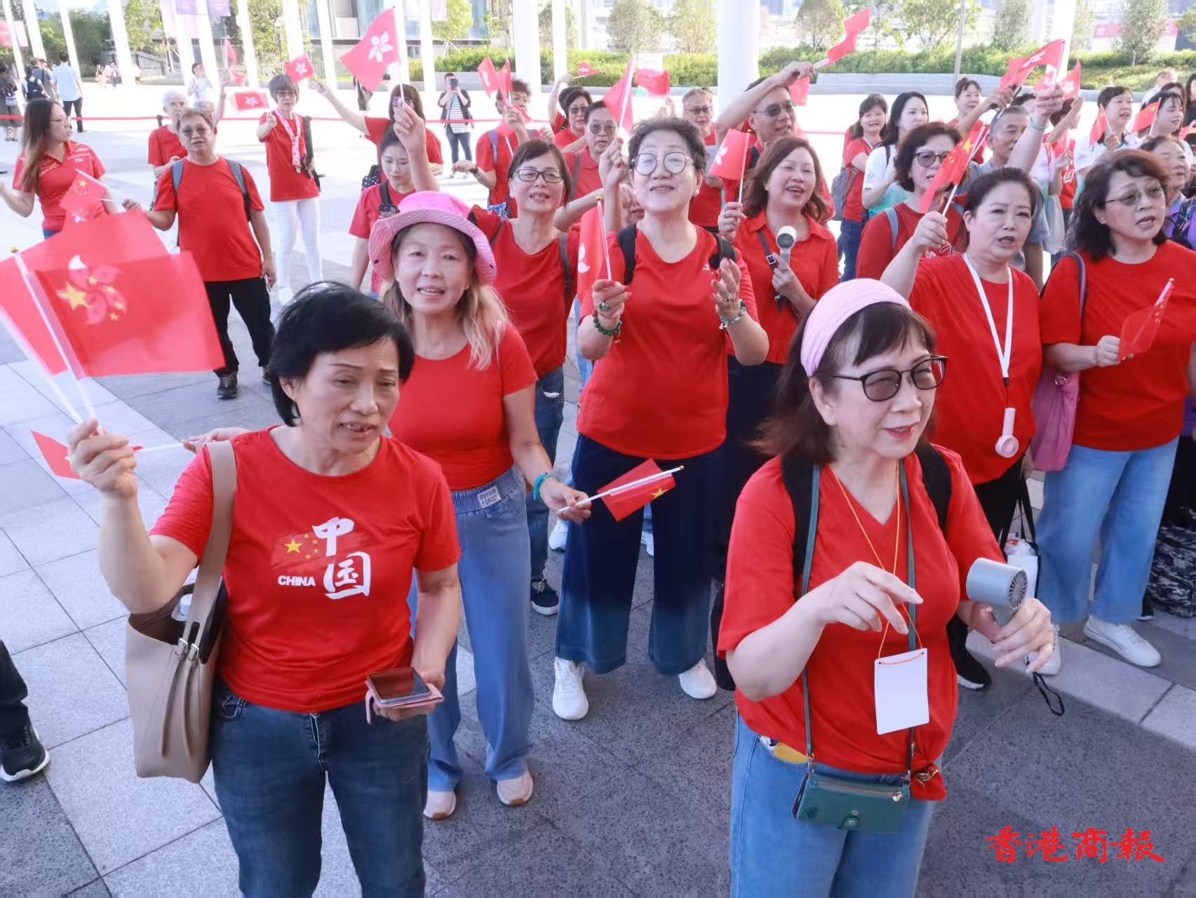 群眾們揮動國旗和特區(qū)區(qū)旗,場面壯觀。