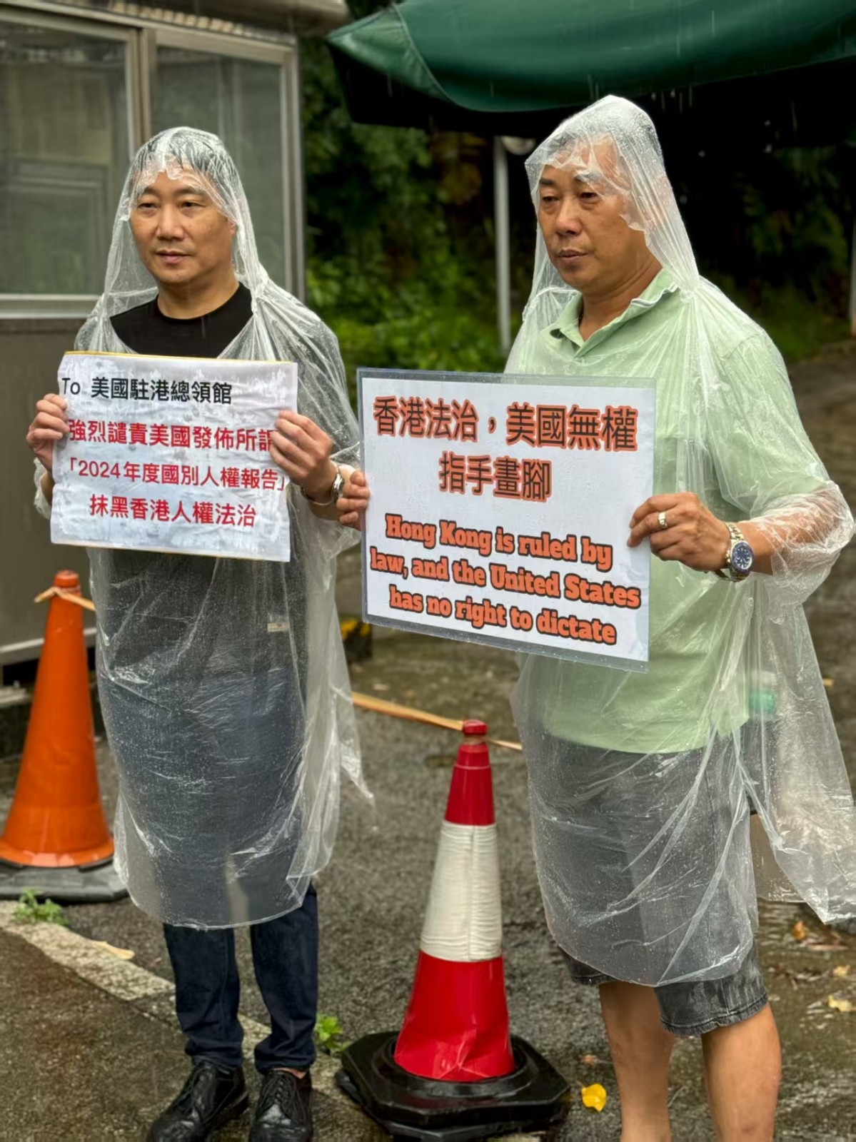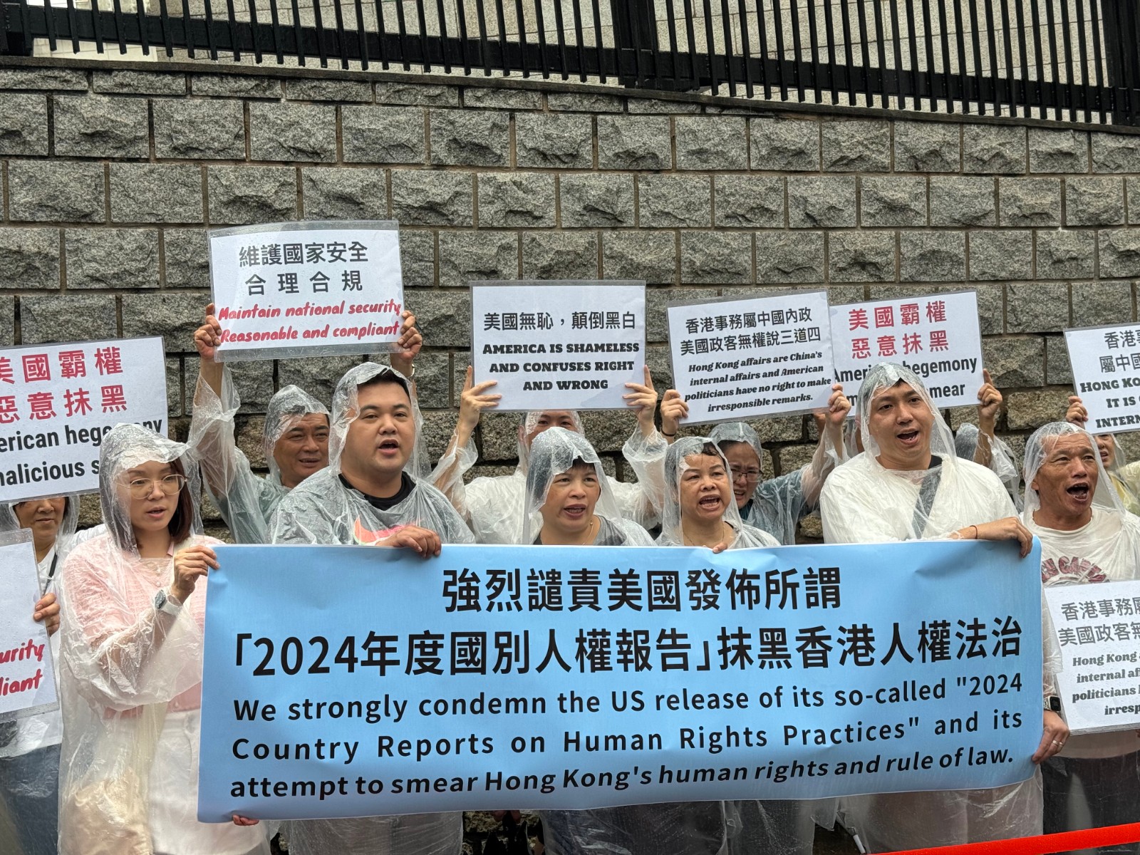 多個政團(tuán)及市民今日(14日)冒著暴雨到美國駐港領(lǐng)事館請願,抗議及譴責(zé)美國再度說三道四。他們強烈不滿及堅決反對美國國務(wù)院發(fā)布的所謂「2024年度國別人權(quán)報告」,詆毀香港維護(hù)國家安全的法律和抹黑香港人權(quán)法治狀況。