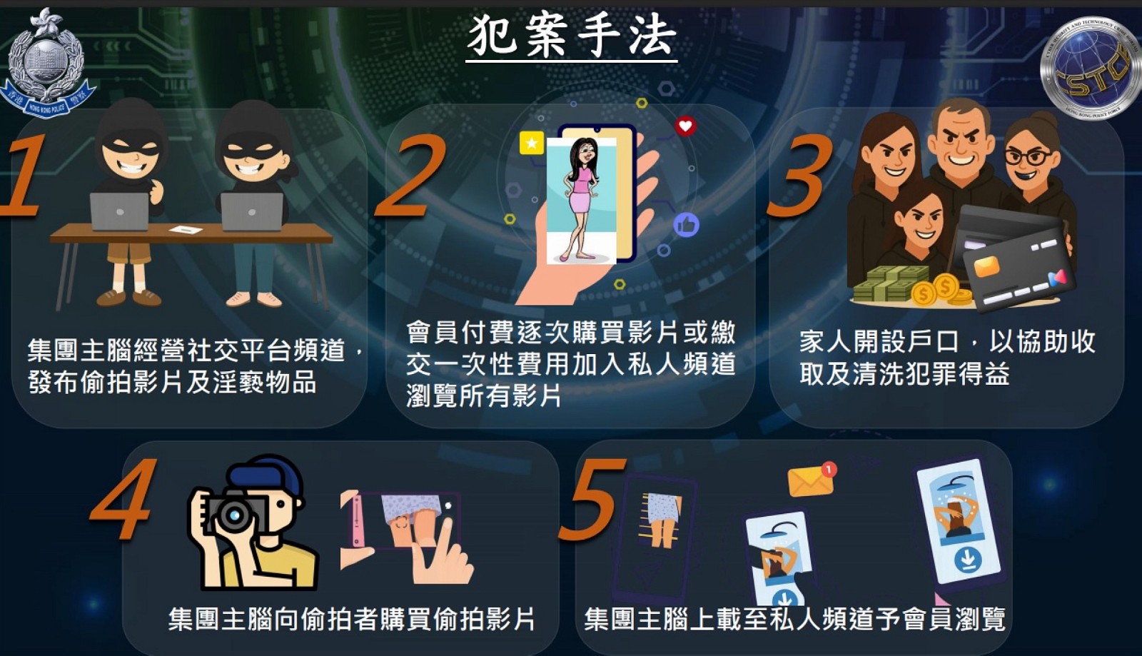 調查得知該社交平臺的頻道由2名集團主腦經營,為一對夫婦,報稱無業(yè),部分骨幹成員負責提供色情及偷拍影像給主腦在頻道發(fā)布。當中偷拍影像全部以女性為目標,大部分在公共交通工具、車站和商場等高人流場所偷拍。兩名集團主腦利用多個家人及集團成員戶口,收取和清洗犯罪得益,總值約400萬元。